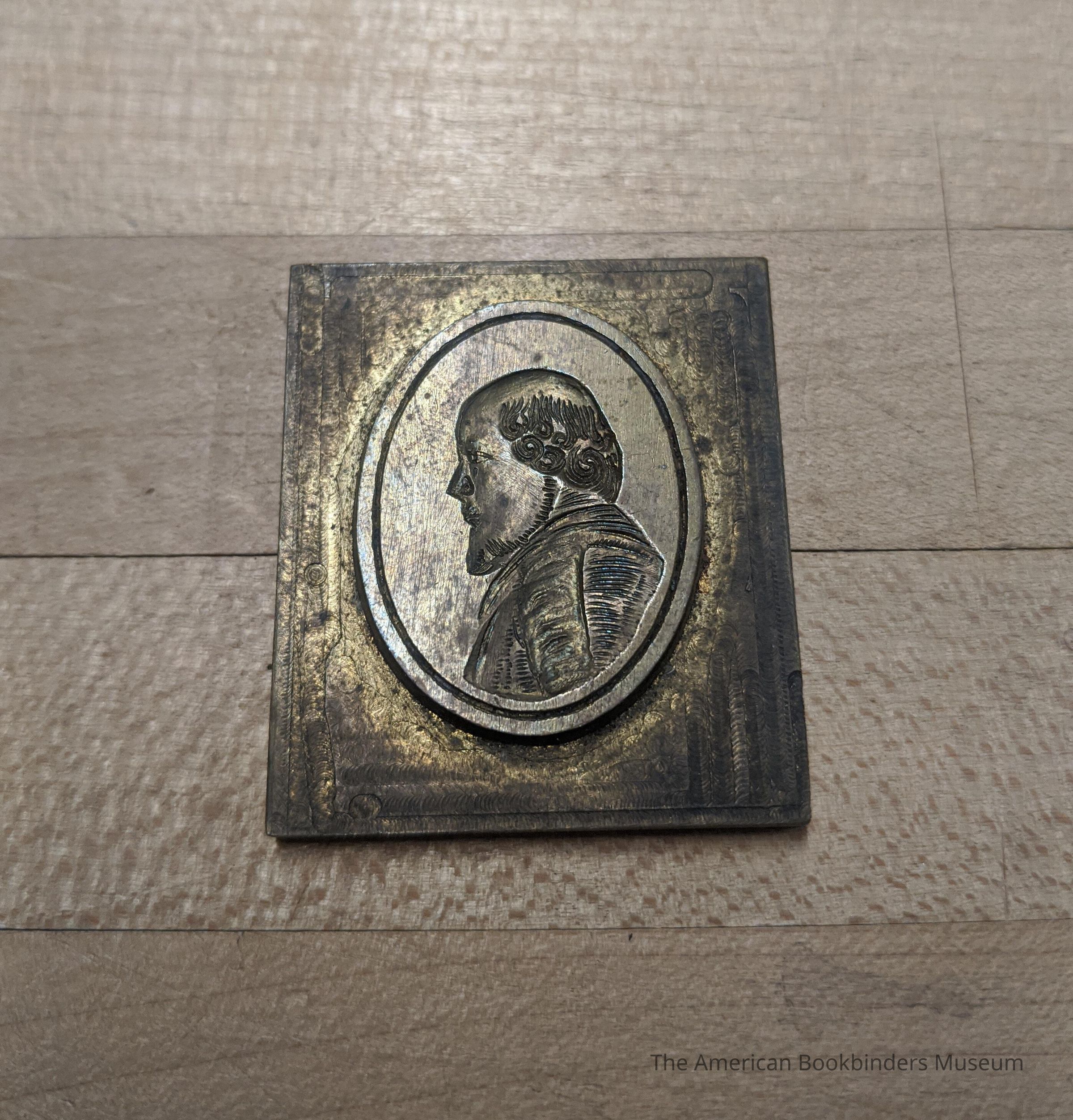 A portrait within an oval border, depicting a male bust seen in profile (facing left, but impression would be facing right). The man has short curly hair, balding at the crown, and a full beard. Appears to be dressed in a suit.