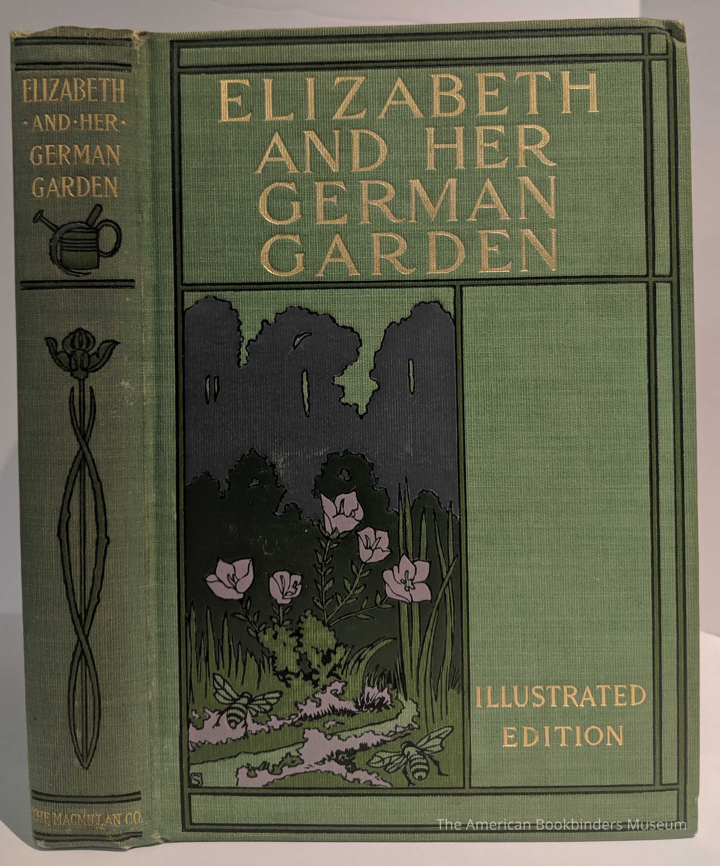 Bound in mint green linen weave cloth in a poster style three-panel decortive cover. Panels are triple-ruled in black and darker green. Top panel stamped with title in gilt, bottom left panel depicts a garden and insects stamped in lavender, black, green, and dark green (note negative stamping to create sky and stream), bottom right panel stamped with "Illustrated Edition". Spine with two-panels, stamped in black, dark green, and lavender, depicting an elongated art-nouveau flower, watering pail, and sickle. Titles in gilt. Top edge gilt, deckled edges.