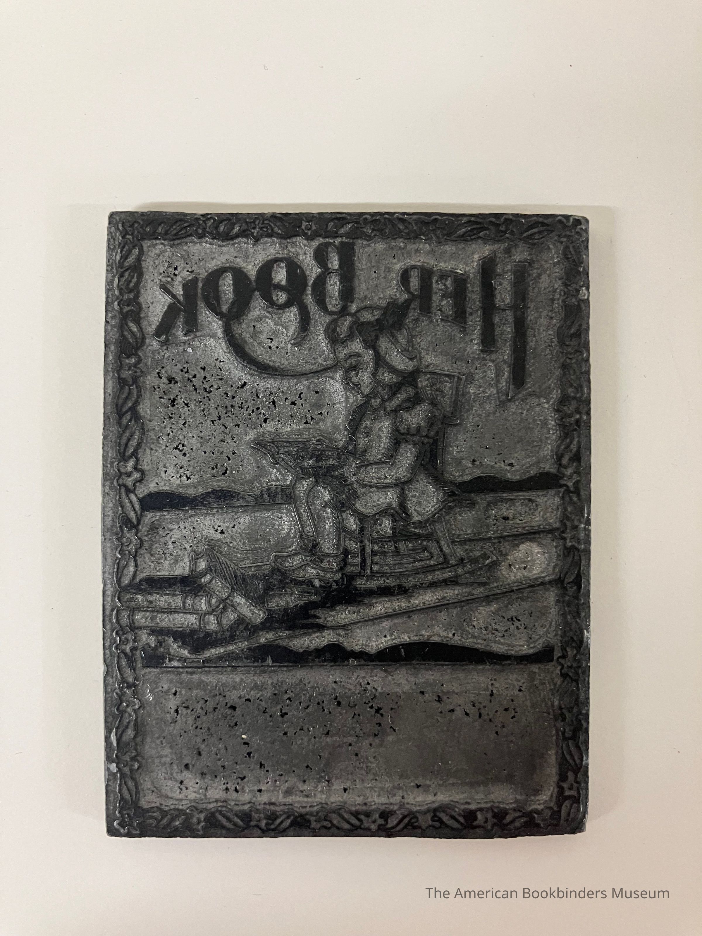A bookplate showing a young girl sitting in a rocking chair, reading. A small pile of books is at her feet. 'Her Book' is written across the top. A rope/vine border with small flowers runs around the edge.