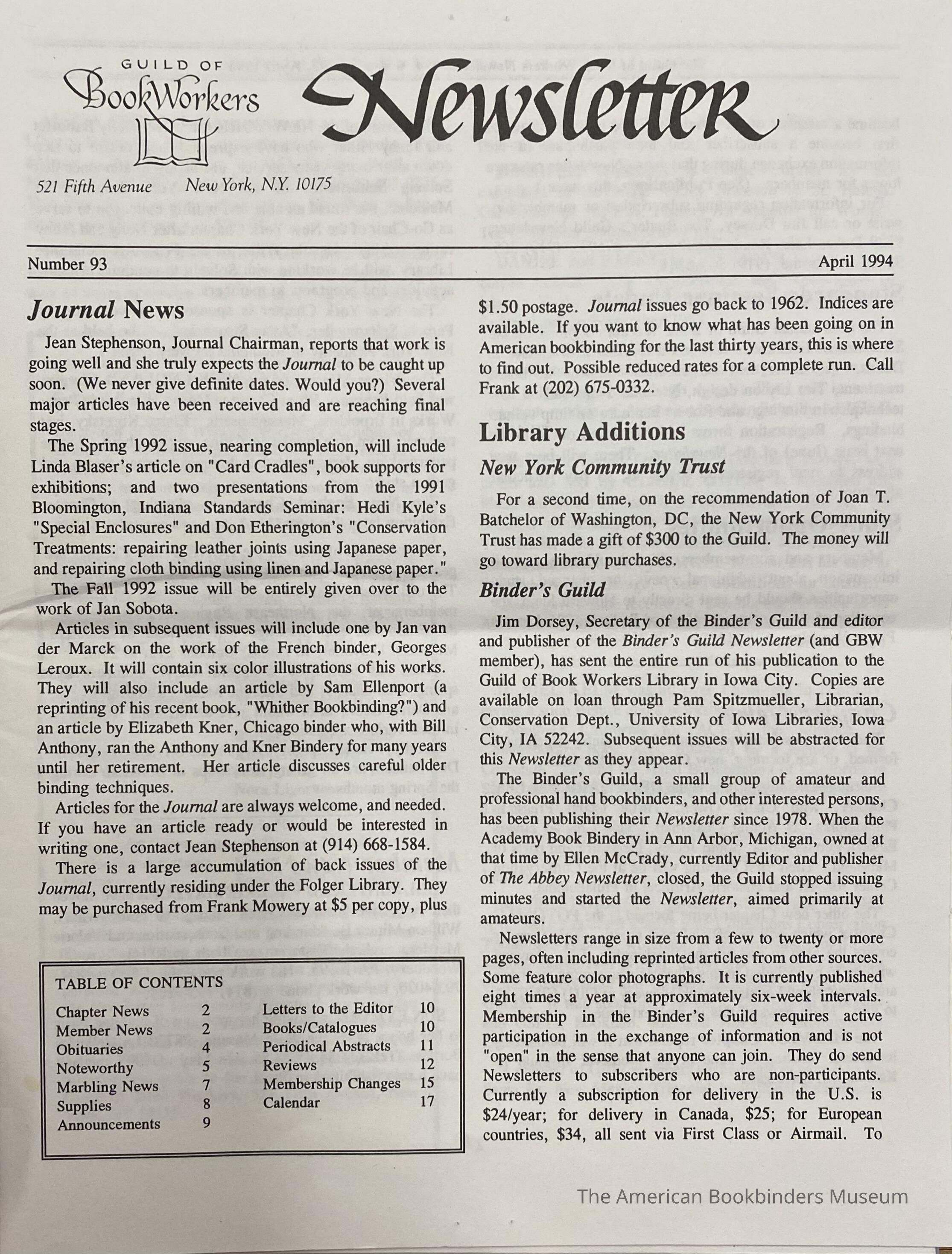 Guild of Book Binders Newsletter ; No. 93 , April 1994Entry/Object ID