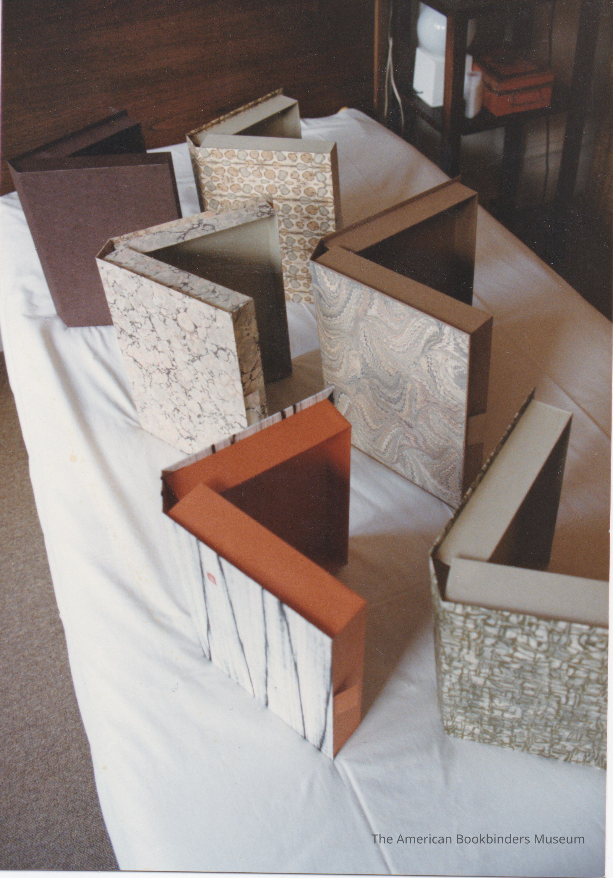 Photo of six drop spine boxes, in three rows of two, standing on a mattress. Same are shown in 2023.9.11.cp through 2023.9.11.ct.