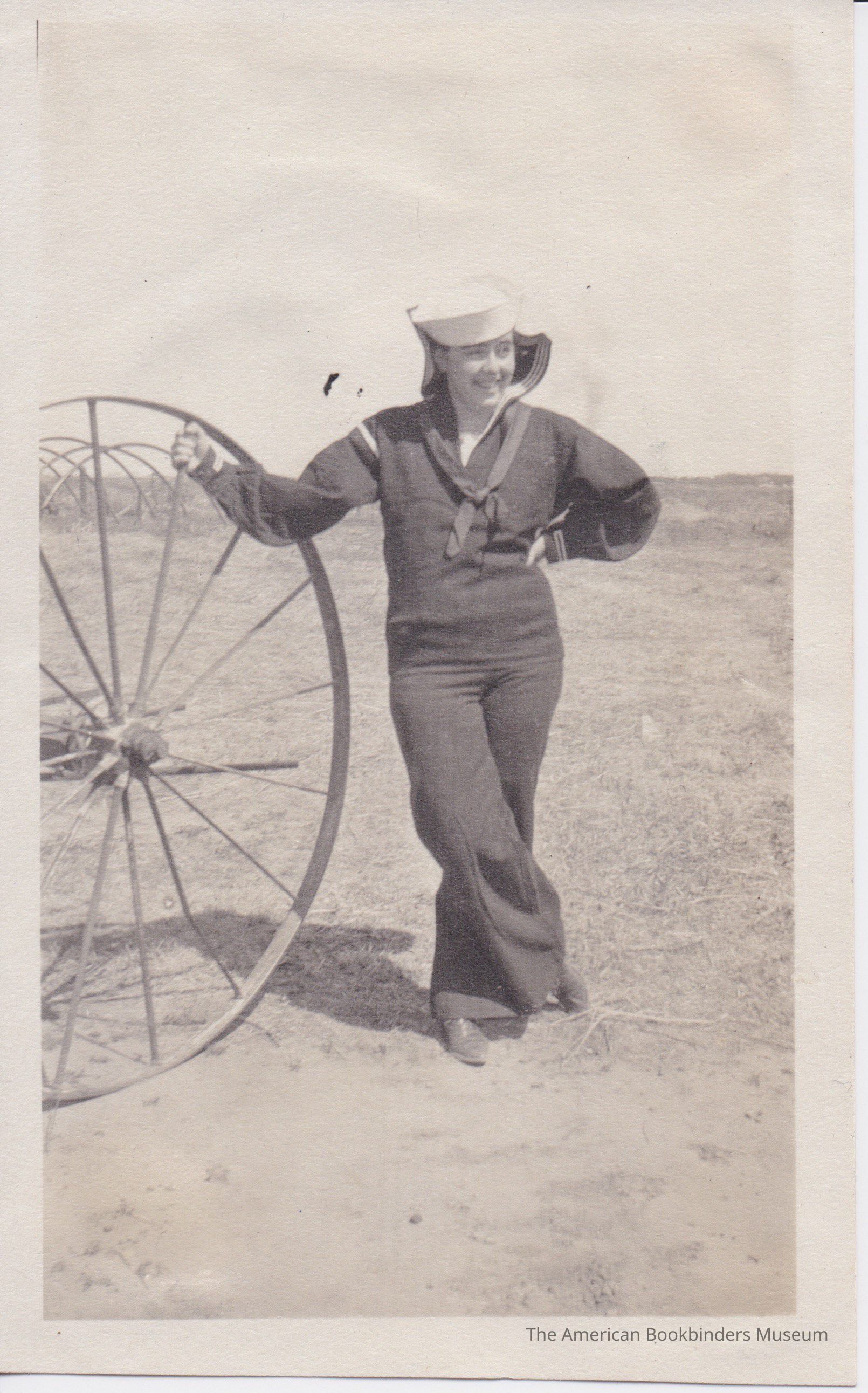 Stella Patri stands next to a metal wheel, in a civilian's version of a sailor's uniform.Photograph Details