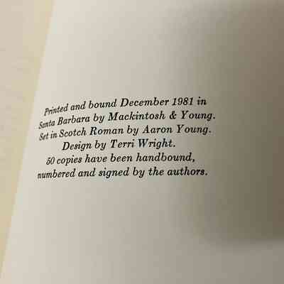 From colophon at back - Printed and bound December 1981 in Santa Barbara by Mackintosh & Young. Set in Scotch Roman by Aaron Young. Design by Terri Wright. 50 copies handbound, numbered and signed by authors.