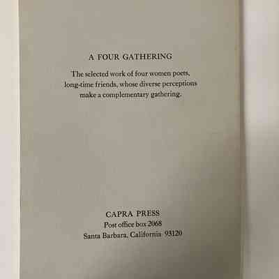 “The selected work of four women poets, long-time friends, whose diverse perceptions make a complementary gathering.”