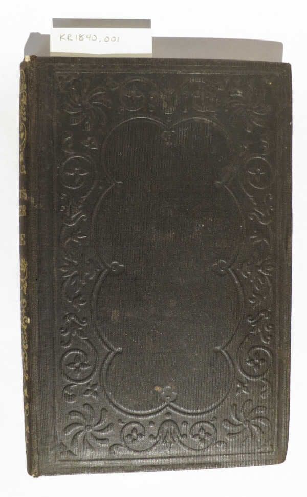Bound in dark brown cloth with blind stamping to front and rear. Gilt decoration to spine stamped with horizontal lines to simulate the raised bands of a leather binding. Three of the panels have floral stamping. Yellow endpapers.
