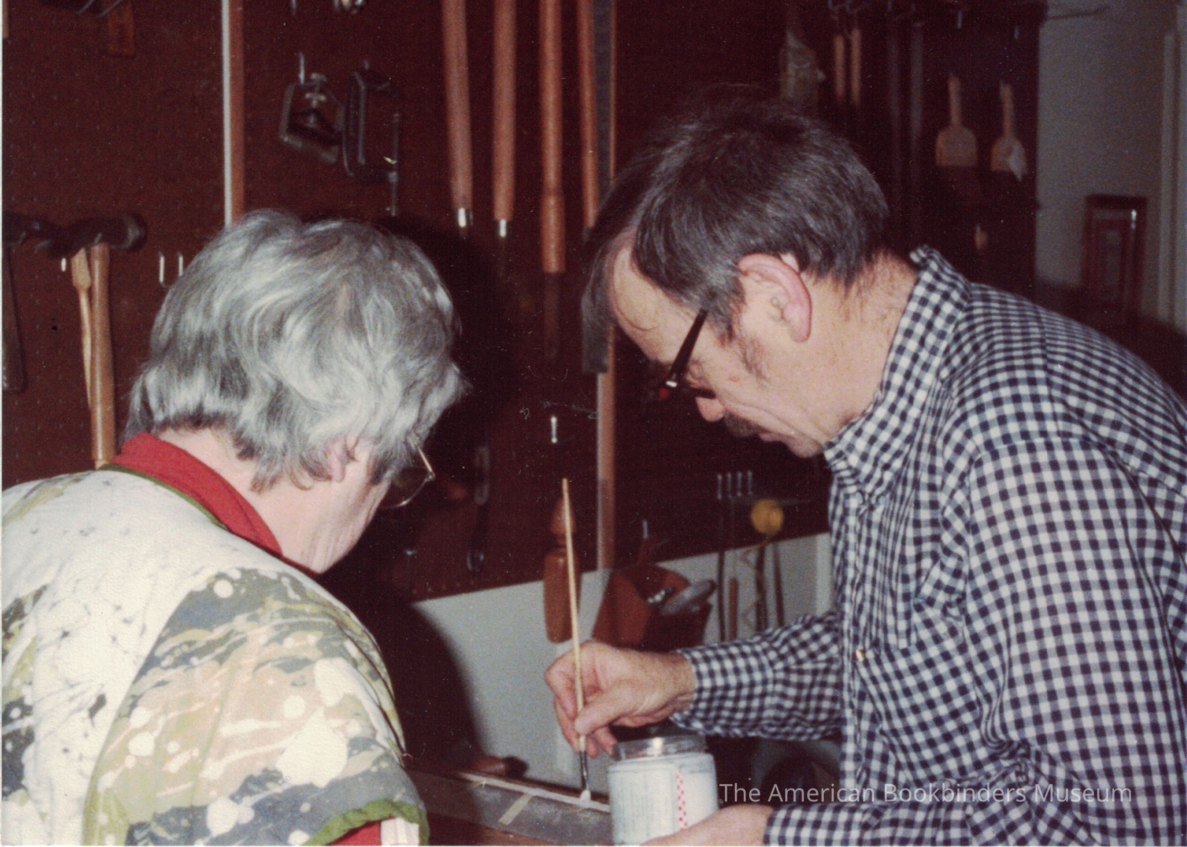 Shows Stella Patri with an older man who is holding a jar and brush. Both are looking down. The background is various tools on a pegboard.Photograph Details
