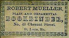 * "Mueller, Robert Herman... left Germany in 1835 and arrived in St. Louis in 1840. he rented a small structure and established a bookbinding shop" papers 1835-1920 Missouri Historical Society, (3 boxes, 1.5 linear ft.) A1106 Quote from A Guide to the Archival Collections at the Missouri Historical Society www.krausehouse.ca/krause/Archives Guide A-Z (WP).htm