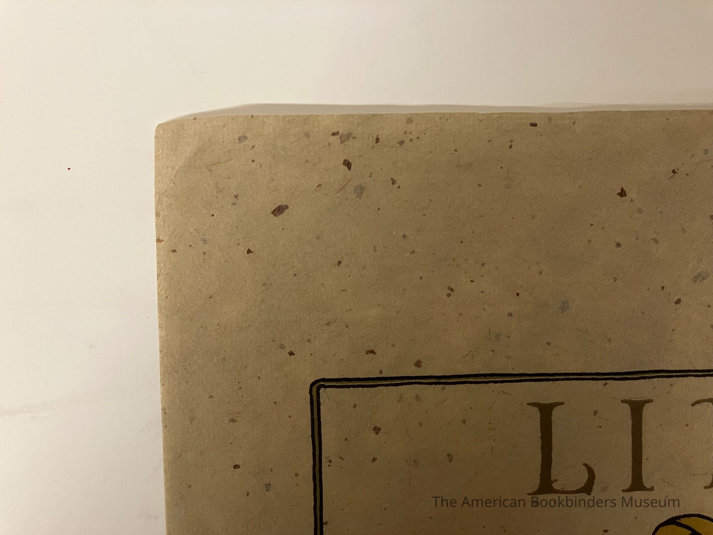 Brown thin paper with dark brown speckles. Bottom and right edges are raw. Center has a frame that leads up to a pair of yellow flowers (irises? orchids?). 'Life' is above both, with the rest of the text between them in brown. 'Humphry Clinker' at the bottom of the frame in black. Printing information below the frame in brownCollection