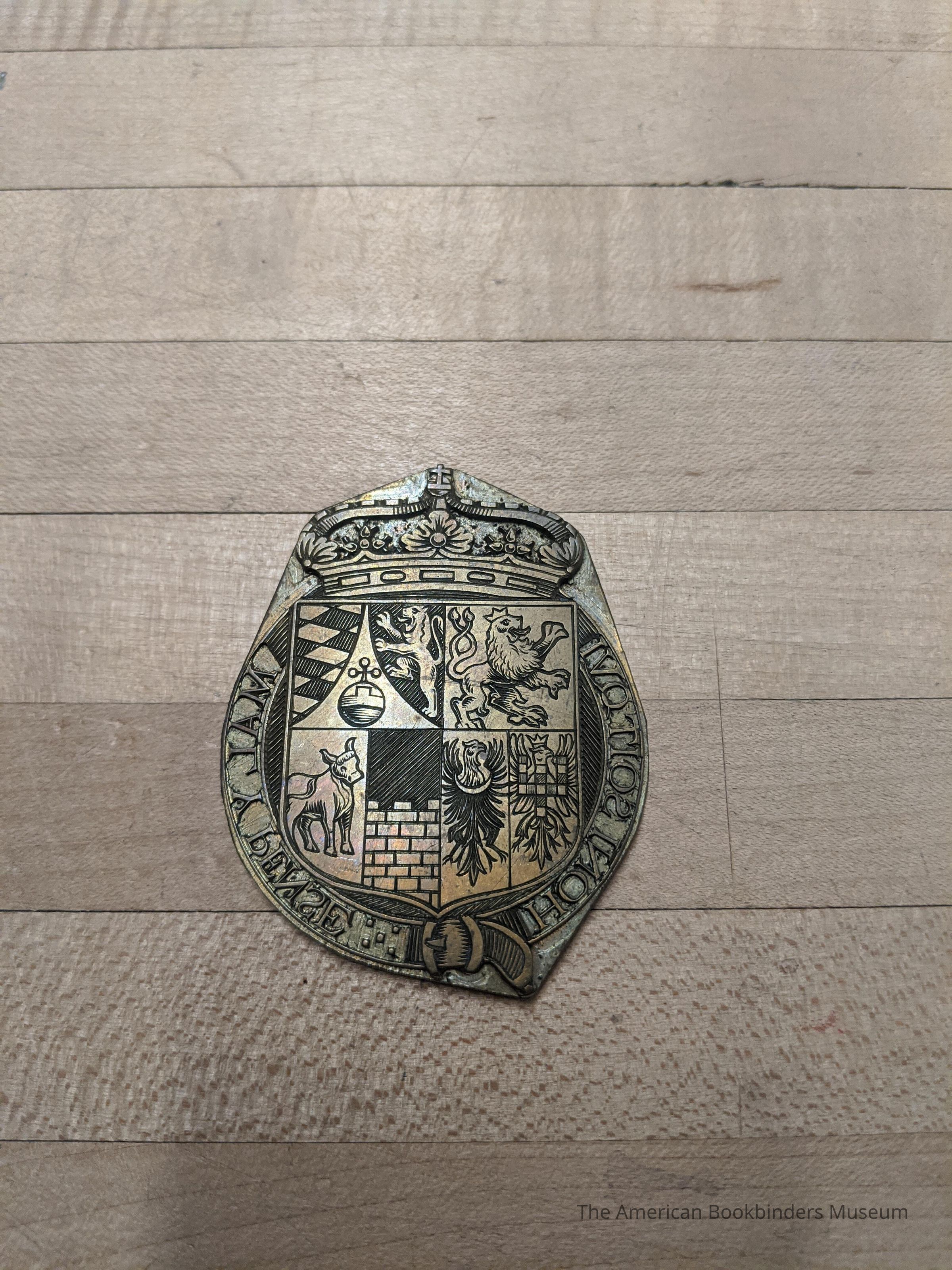 A coat of arms: A quadripartite shield surrounded with a belt with the phrase "honi soit qui mal y pense" (the French motto of the British Order of the Garter) on it and crowned. Any member of the order could use the belt/garter border over their own coat of arms.