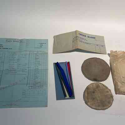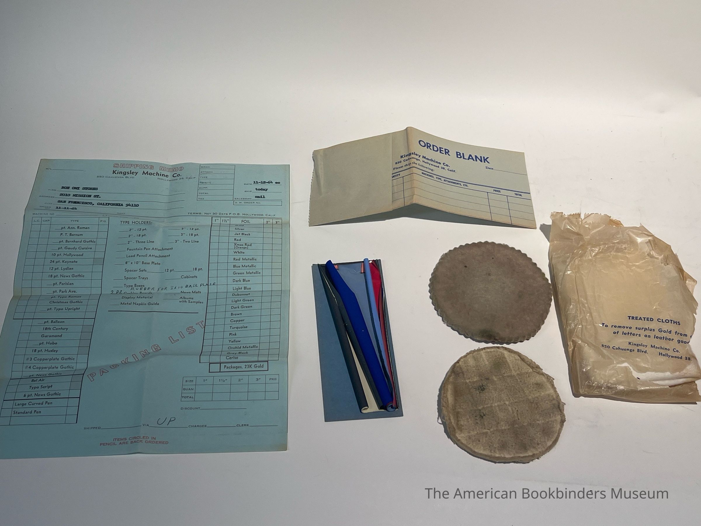 Cardboard box, shipping memo, order form, various foil samples, treated Kingsley cloths, and round cloths