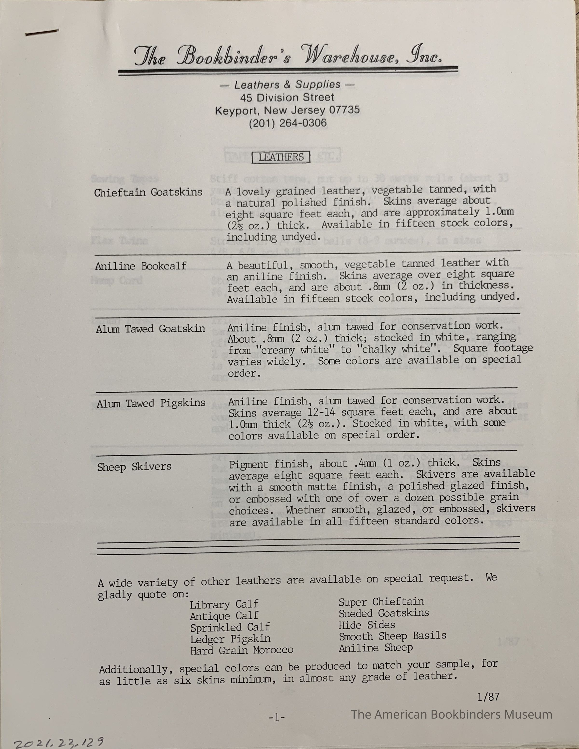 The Bookbinder's Warehouse, Inc. [January 1987 catalog]Entry/Object ID