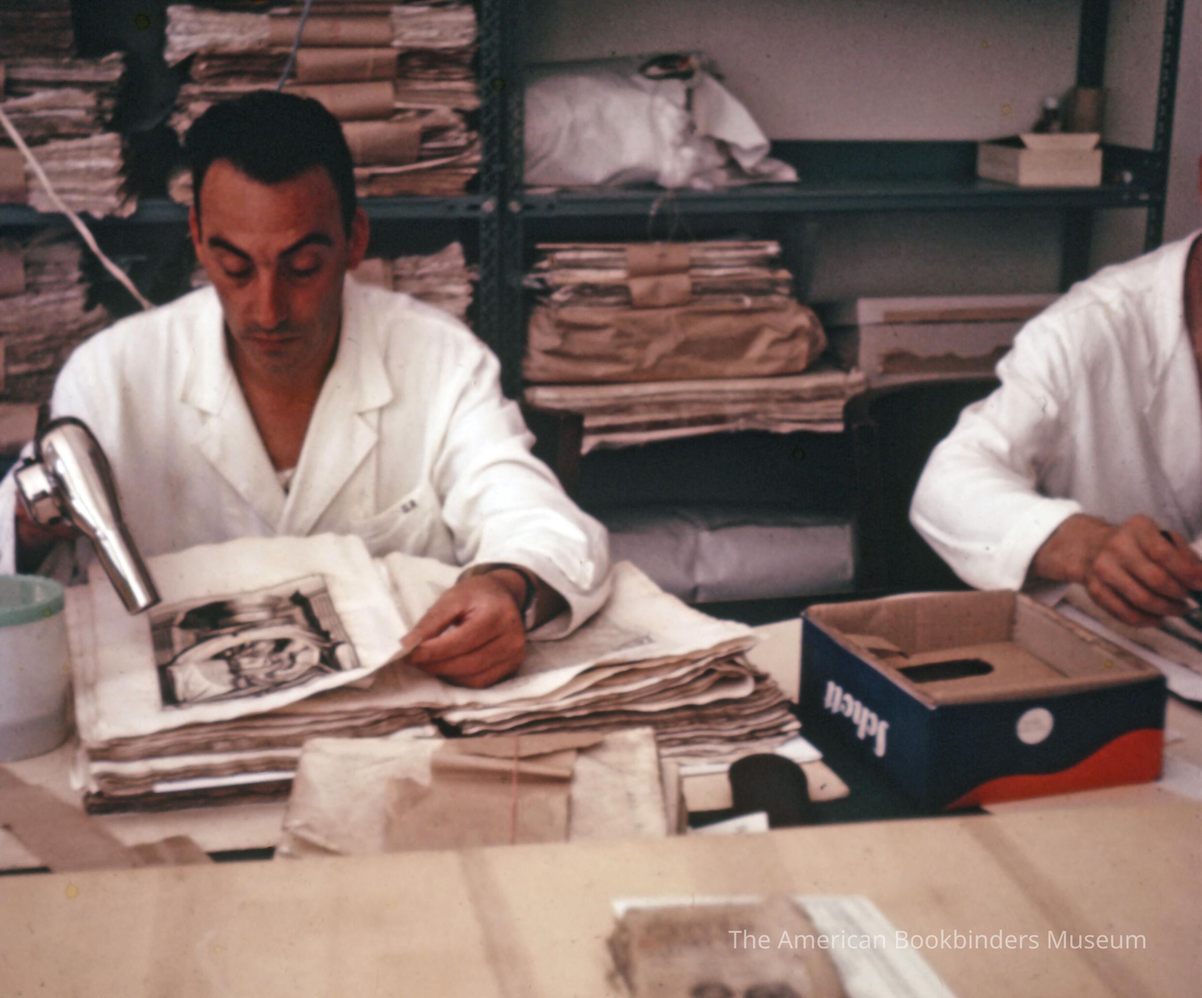 Scan of a slide. Two conservators are working on books. The one fully in frame is using a hairdryer. Various pages are stacked behind them.Photograph Details