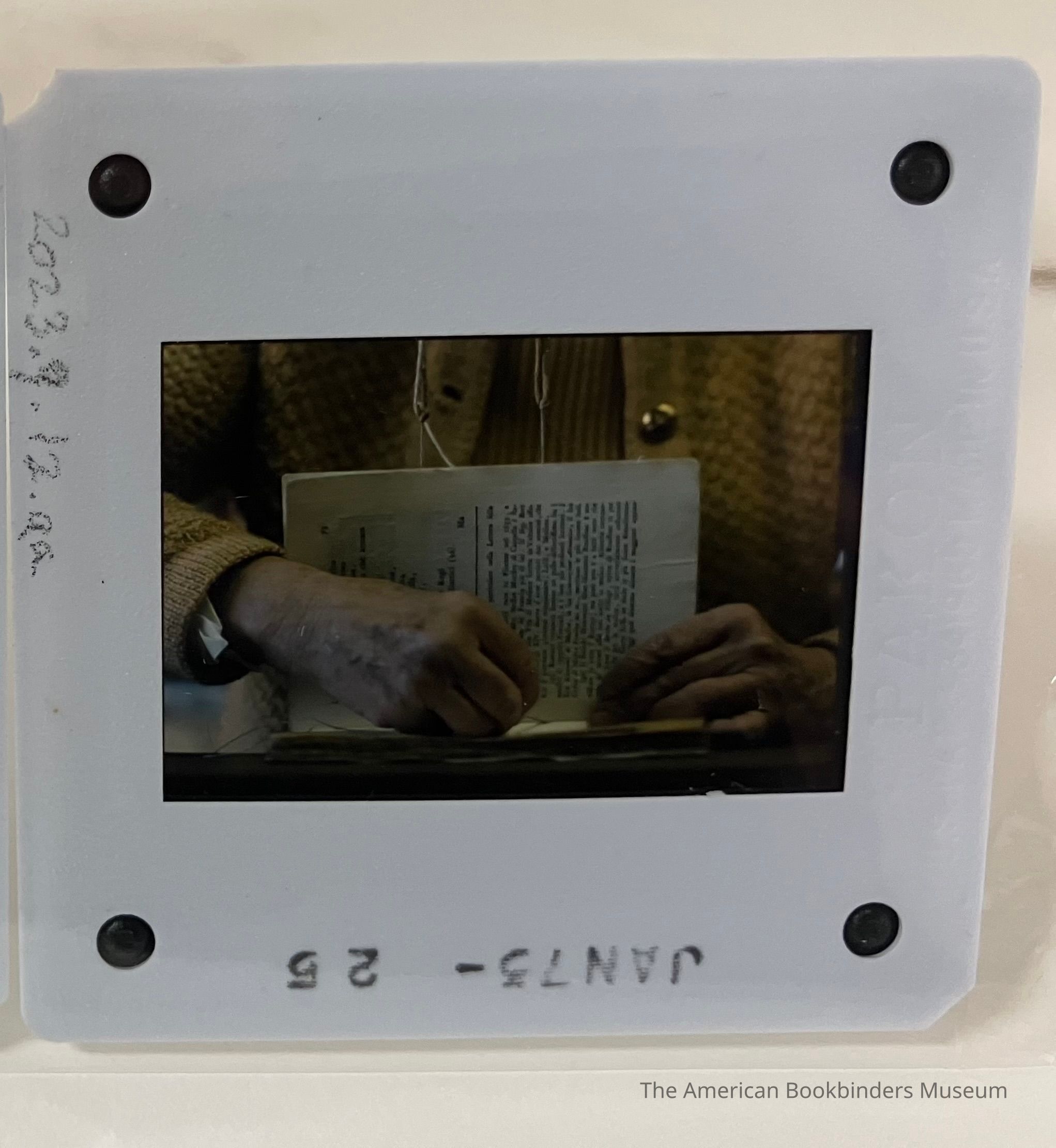 Slide showing Patri's hands and a text block on a sewing frame, with Patri sewing the text block together. One page is held up, with Patri showing where the needle should be placed.Photograph Details
