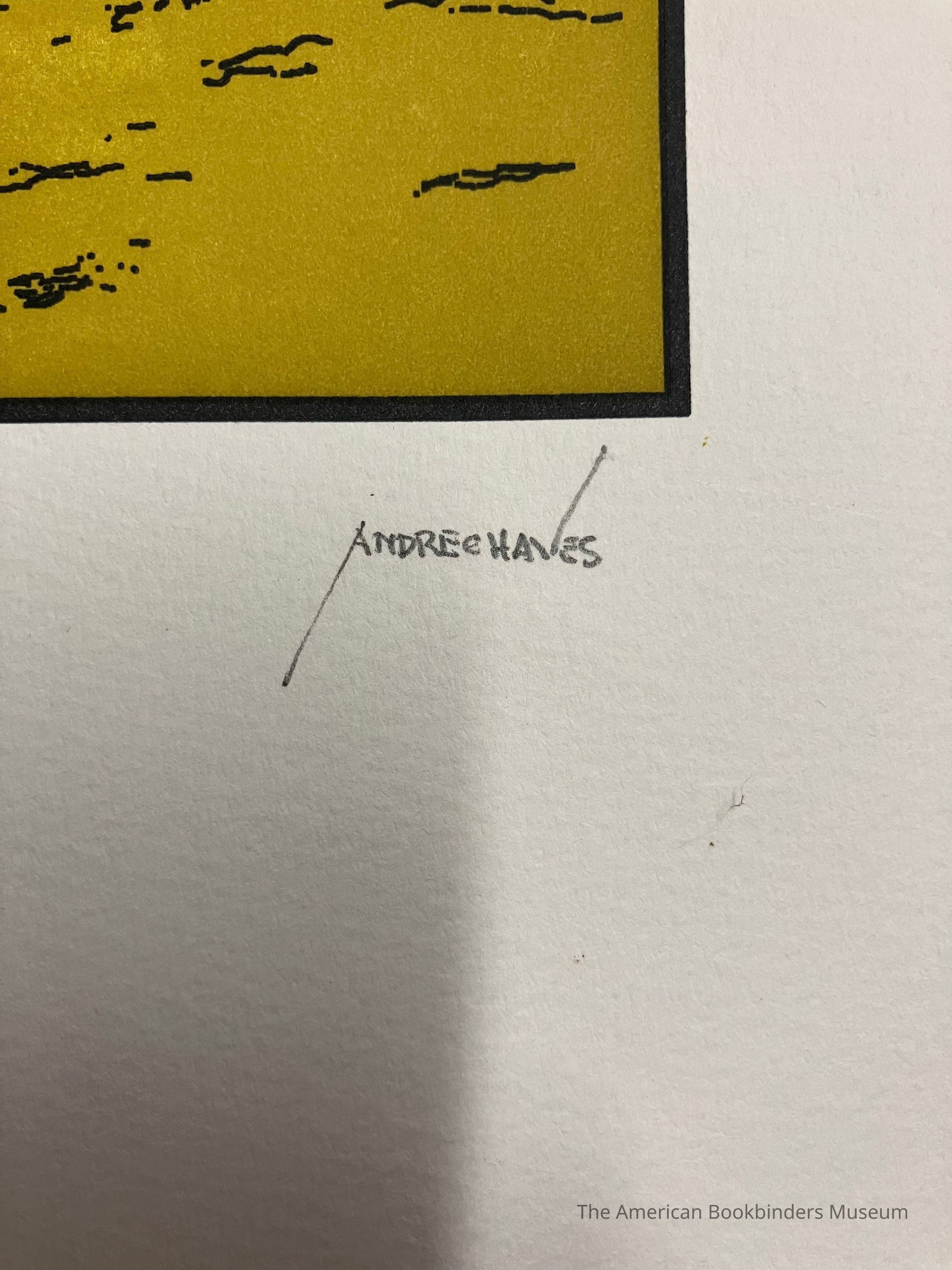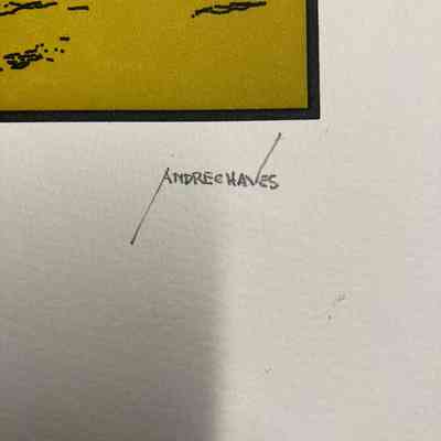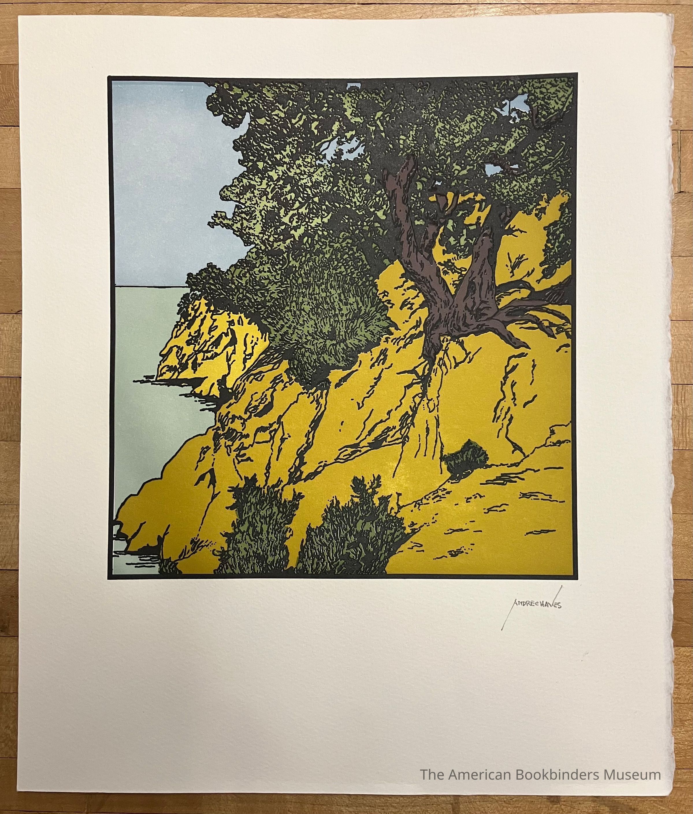 Blue sky and light green water. The cliff face is mostly devoid of life, in core yellow, but has some green shrubs in the bottom center and on the cliff in the background. A tree sits on the right, brown bark and green leaves. Right edge is raw.Collection