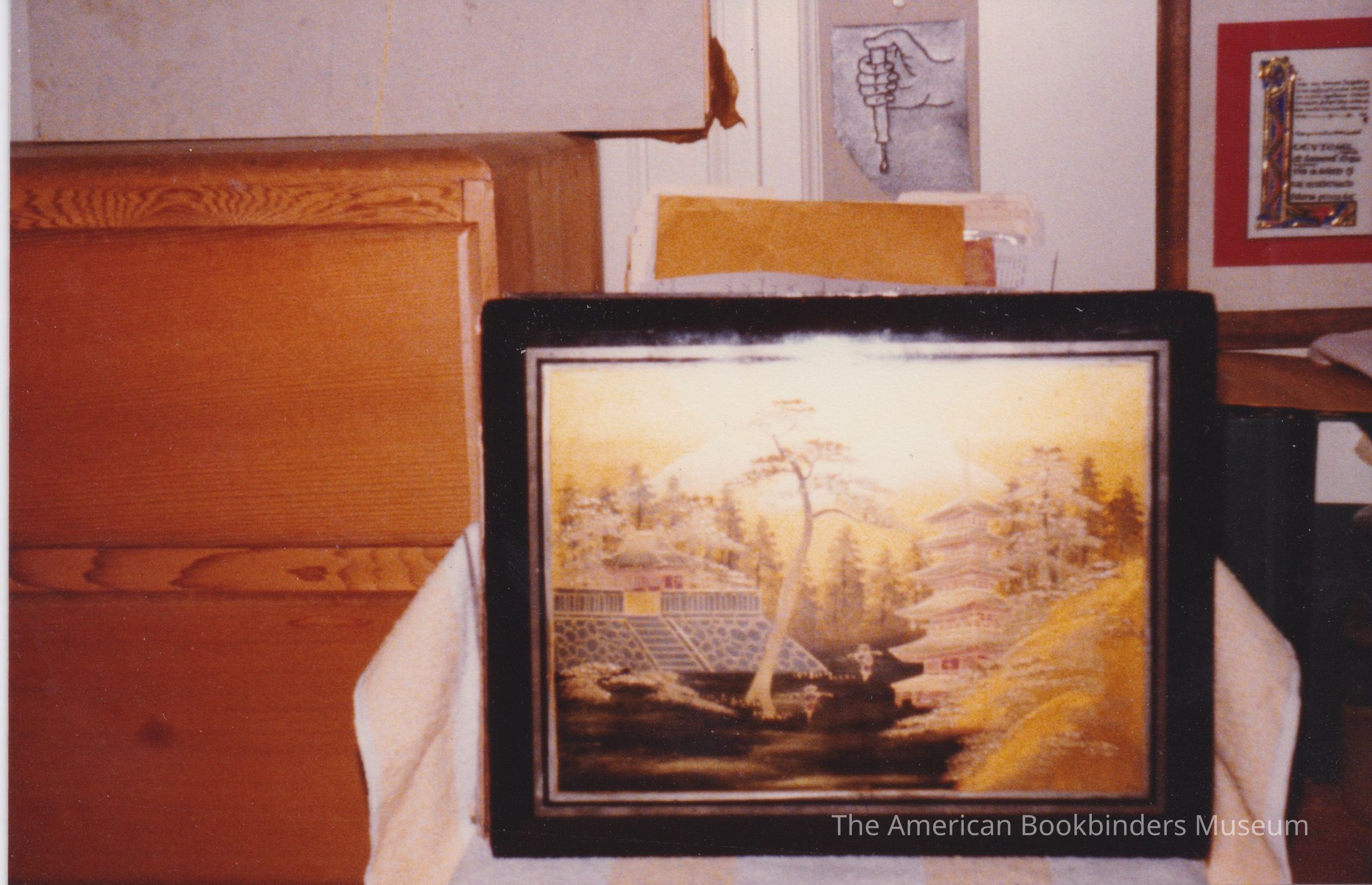 Photo showing a framed Japanese work. To the left is a set of drawers. The background shows a print of how to use a hand tool.