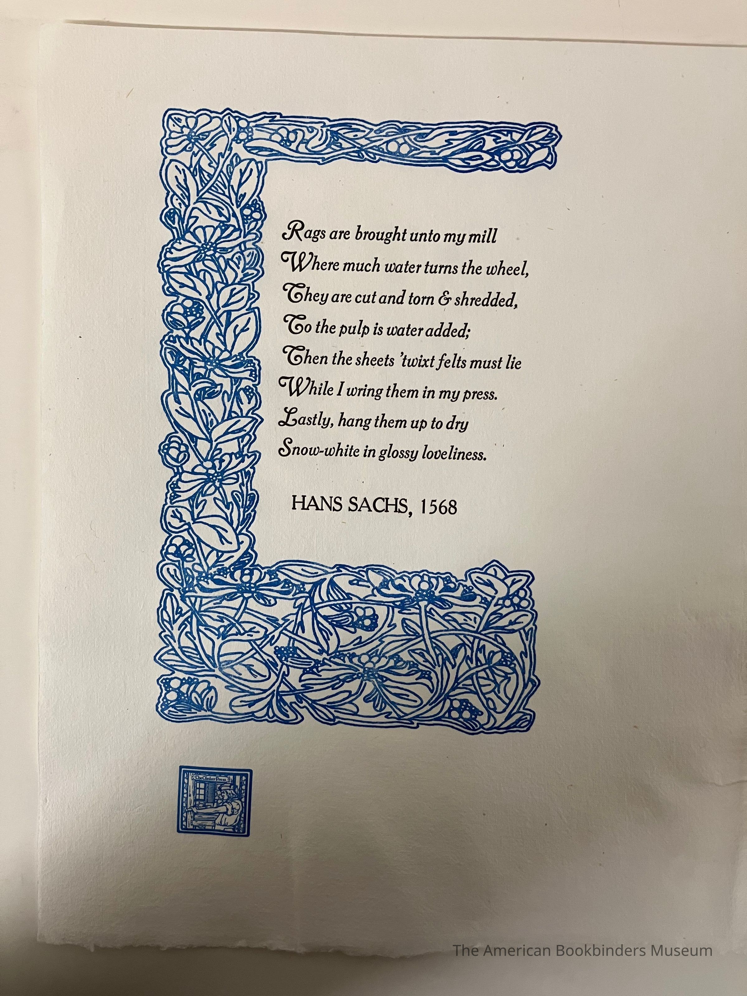 Partial border made of flowers like daisies, with leaves and berries, all in blue ink. Text in black. Bottom left has printer's mark. Bottom and right edge is raw.Collection