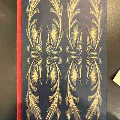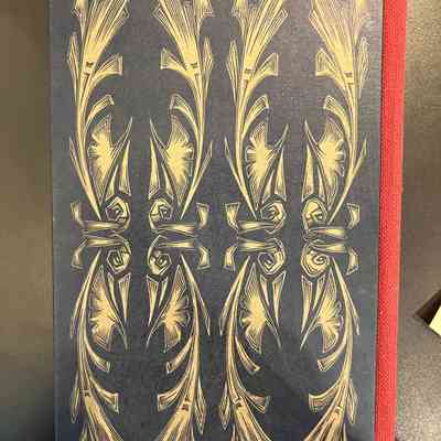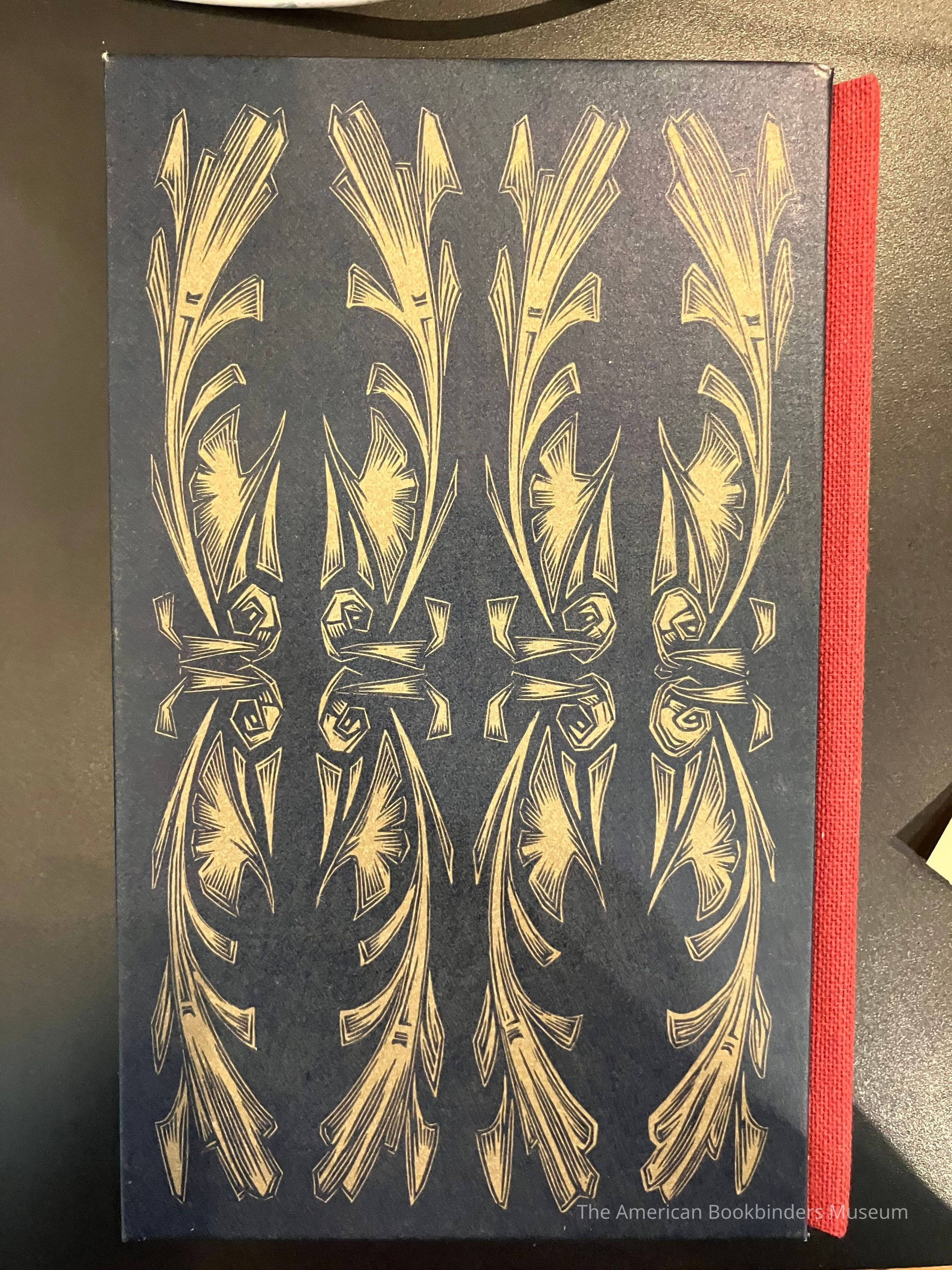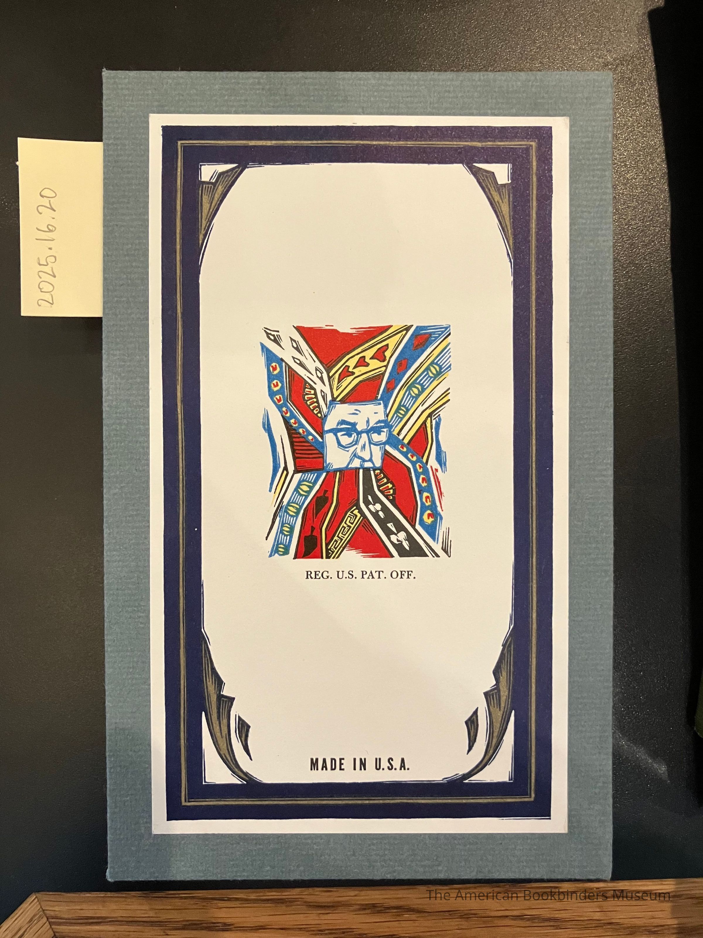 Case and hardback book. Case shows a variation of a King card, with all suits visible and part of the face in the center. Set in a frame of dark blue with gold accents. Case is covered in gray-blue paper. Book has red cloth covered spine, with covers ob black background with gold accents. Covers were pasted over the cloth of the spine.