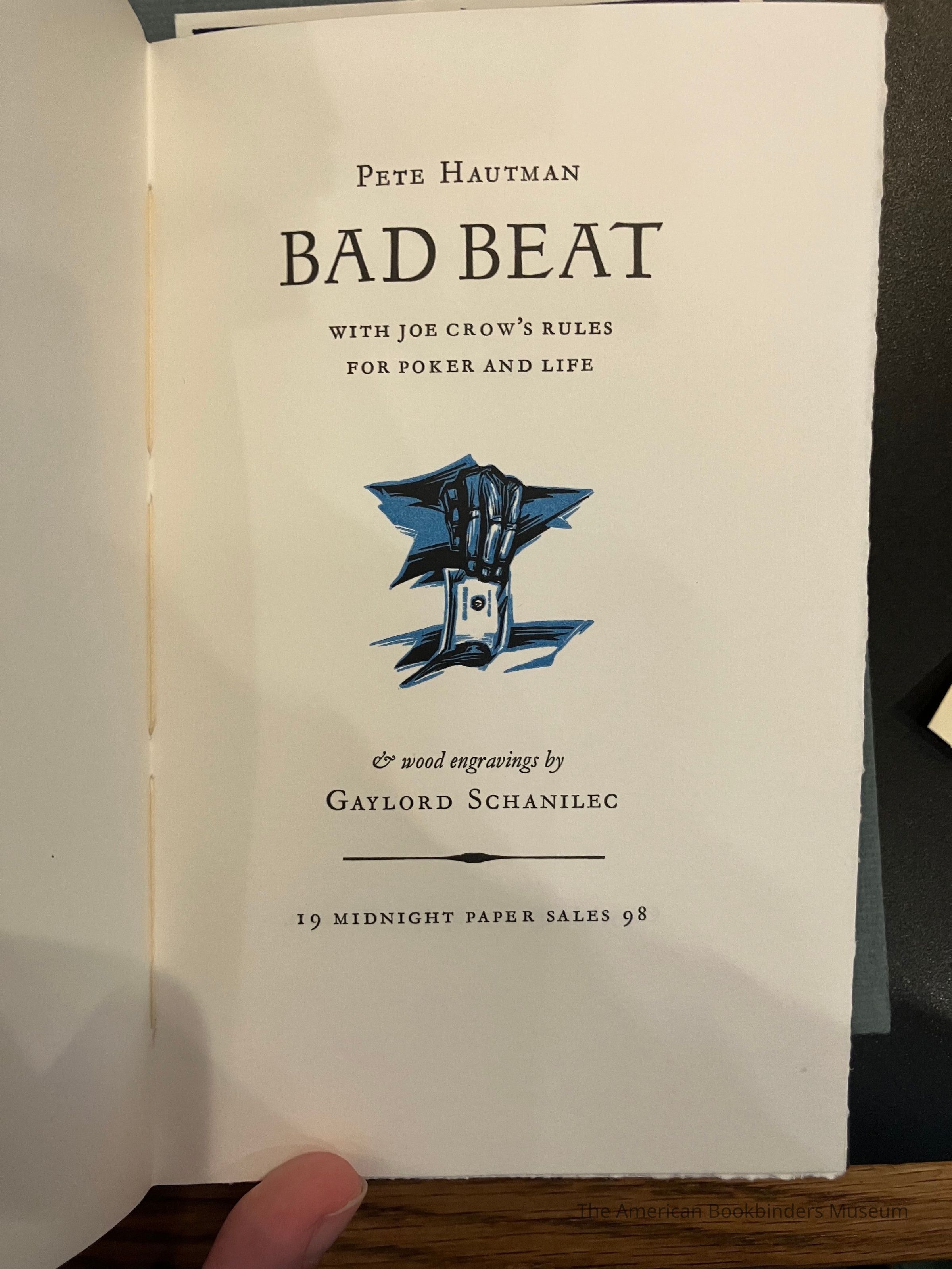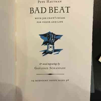 Novelist Pete Hautman is a player. Early one morning the rest of us were moving as quickly as we could toward home. Pete, however, stood thoughtfully analyzing the game—who won, who lost, and why. Bad Beat takes place in Zink’s club 34, a familiar bar with a card game going on upstairs. In the course of the story we learn to the meaning and implications of the term "bad beat". 56 pgs.Collection
