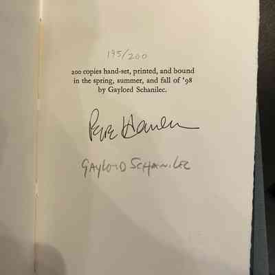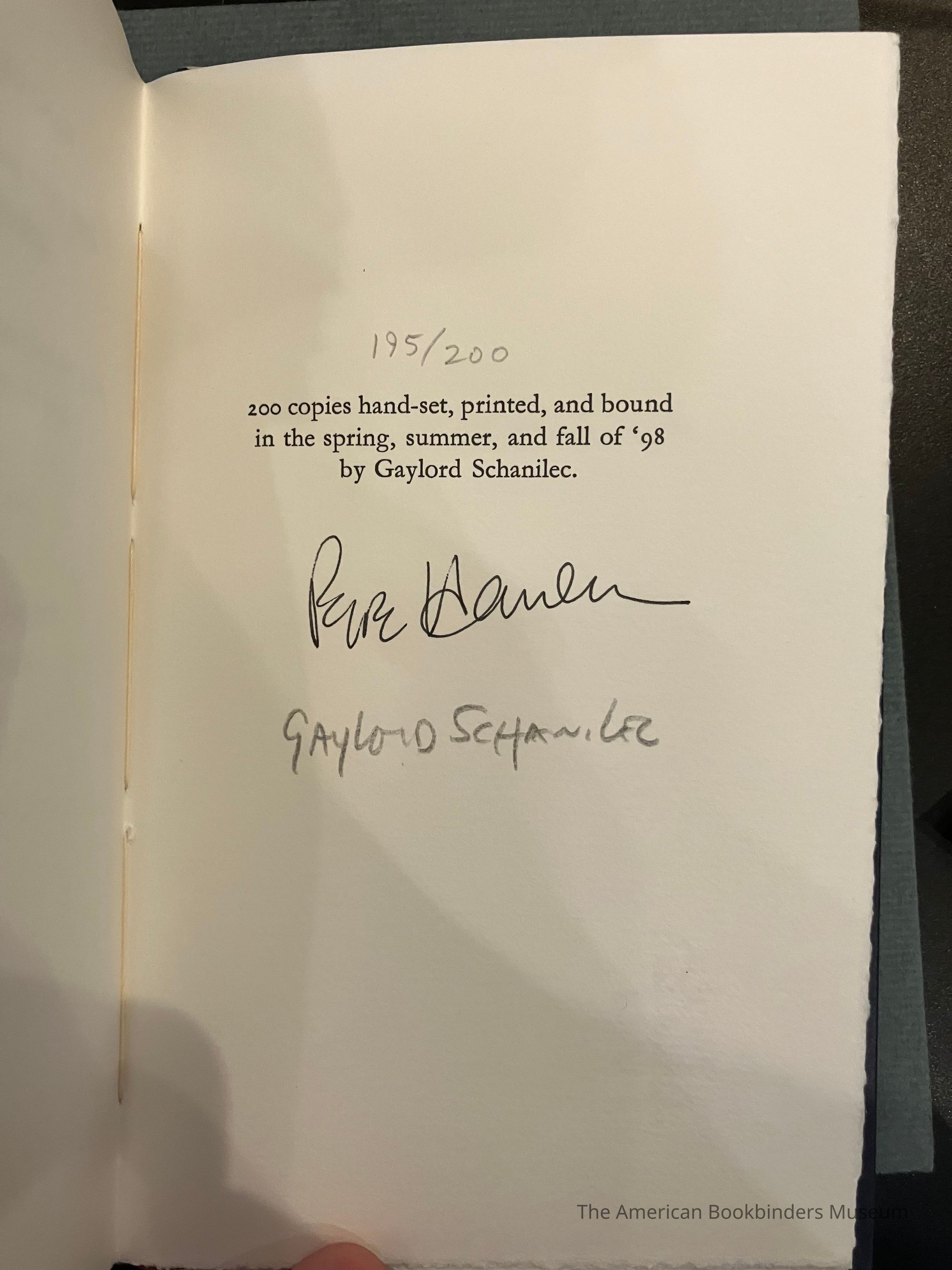 Colophon - 200 copies hand set, printed, and bound in spring, summer, and fall of 1998.