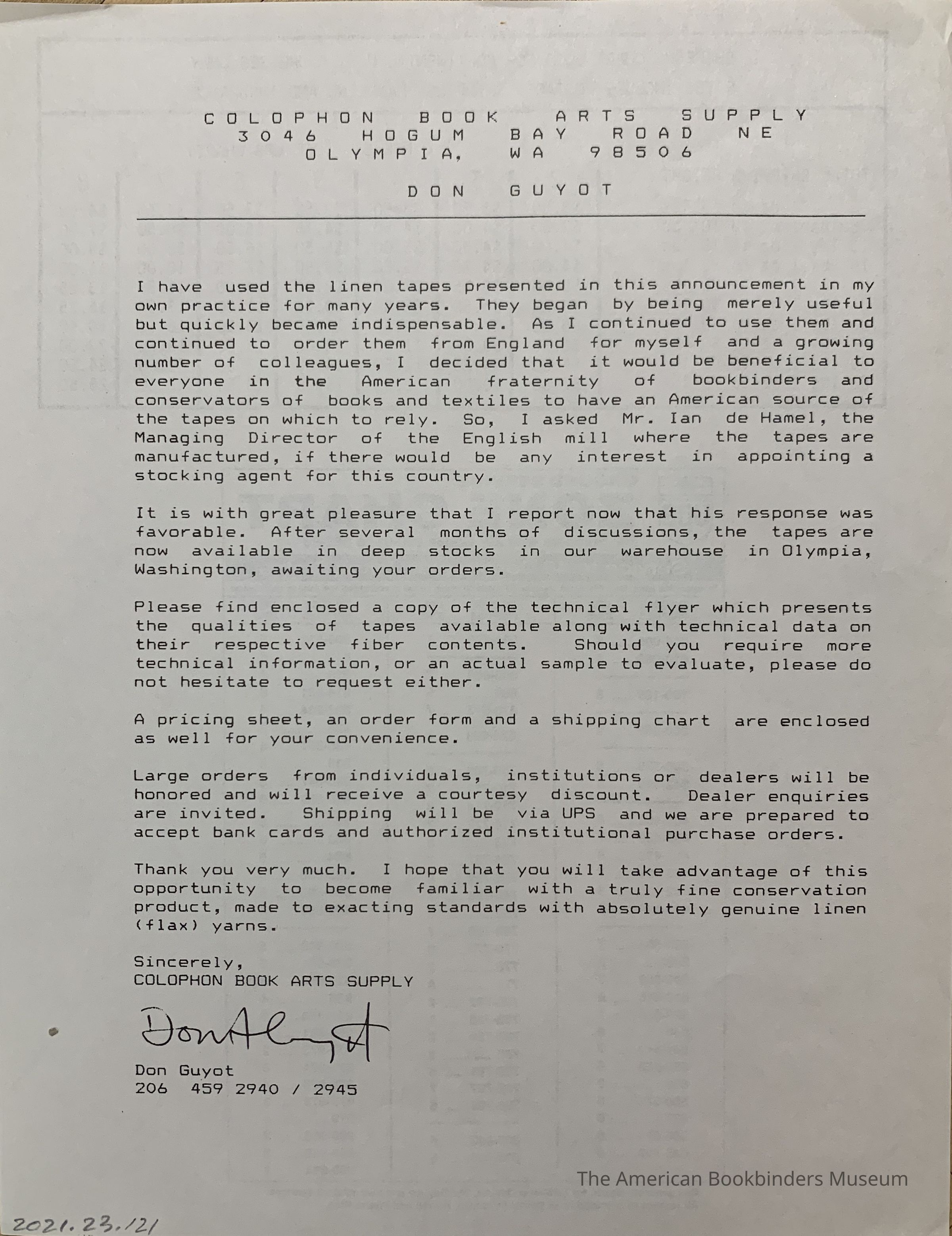 An announcement from Colophon of now being the stocking agent for the US, with shipping information on the back.