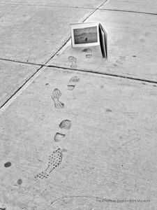 A pair of footprints, though they are not from the same shoes, are impressed in the cement sidewalk, leading to an open book. The book has a photograph of a person in the desert and the footprints stop right in front.Photograph Details