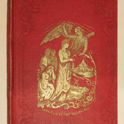 Bound in red cloth with blind stamped borders to front and rear. Central gilt stamped religious scene of angel and mortals with a Burmese view in background with "Faithful is he that calleth you" stamped at the bottom. Spine decoration in gilt. Tissue guarded frontis.