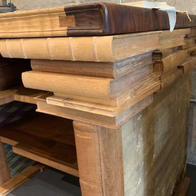 "Wooden table consisting of 48 hand shaped books as supports for ends, two large books acting as ends, one large book as center divider, four drawers, two internal shelves and one multi panel top." (Maker's description)Use