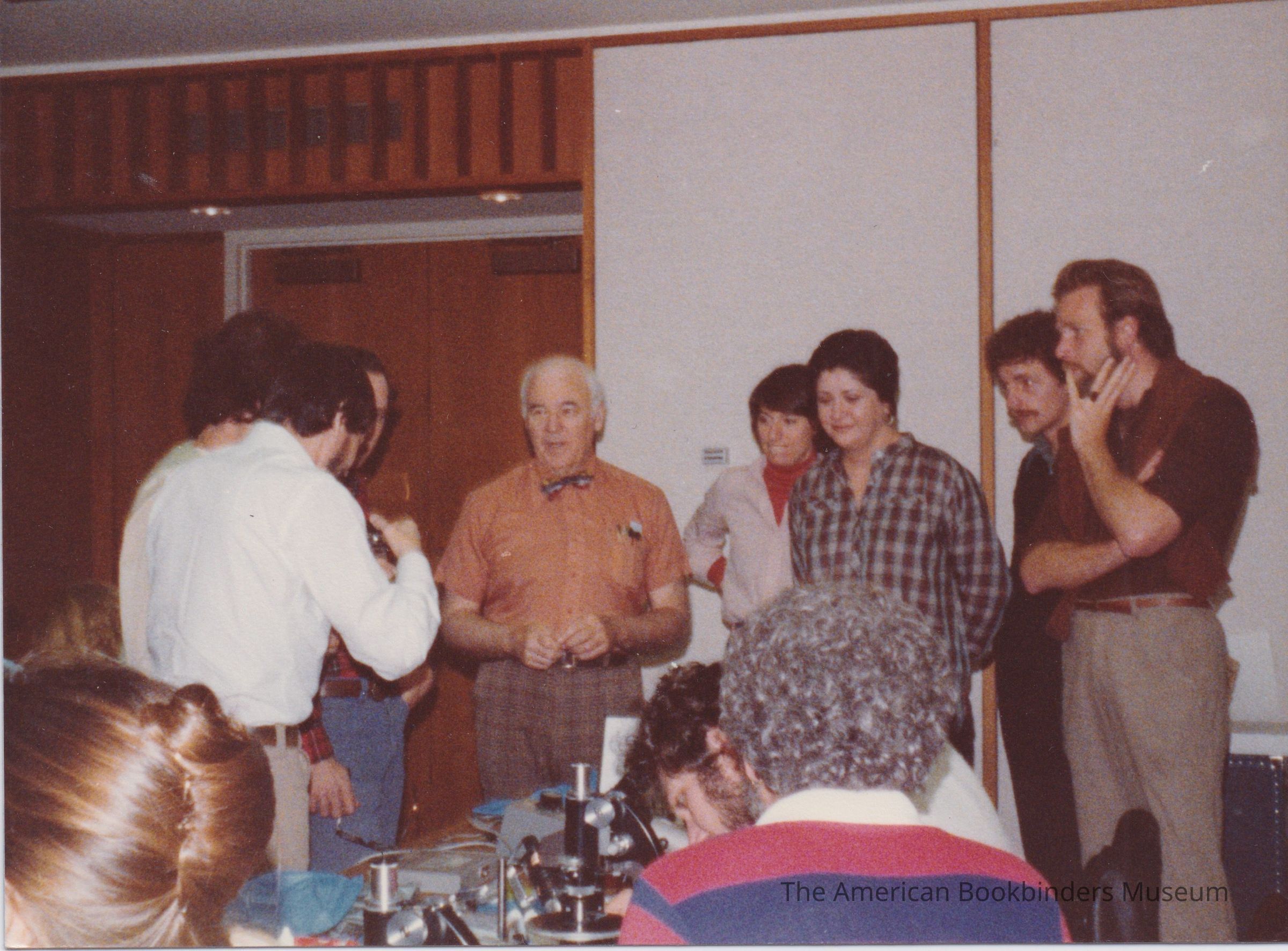 Photo of people in a lab setting, indicated by the microscopes on the table at the bottom of the frame. Eight figures stand at the end of the table the microscopes are set up on, forming a semi-circle.Collection