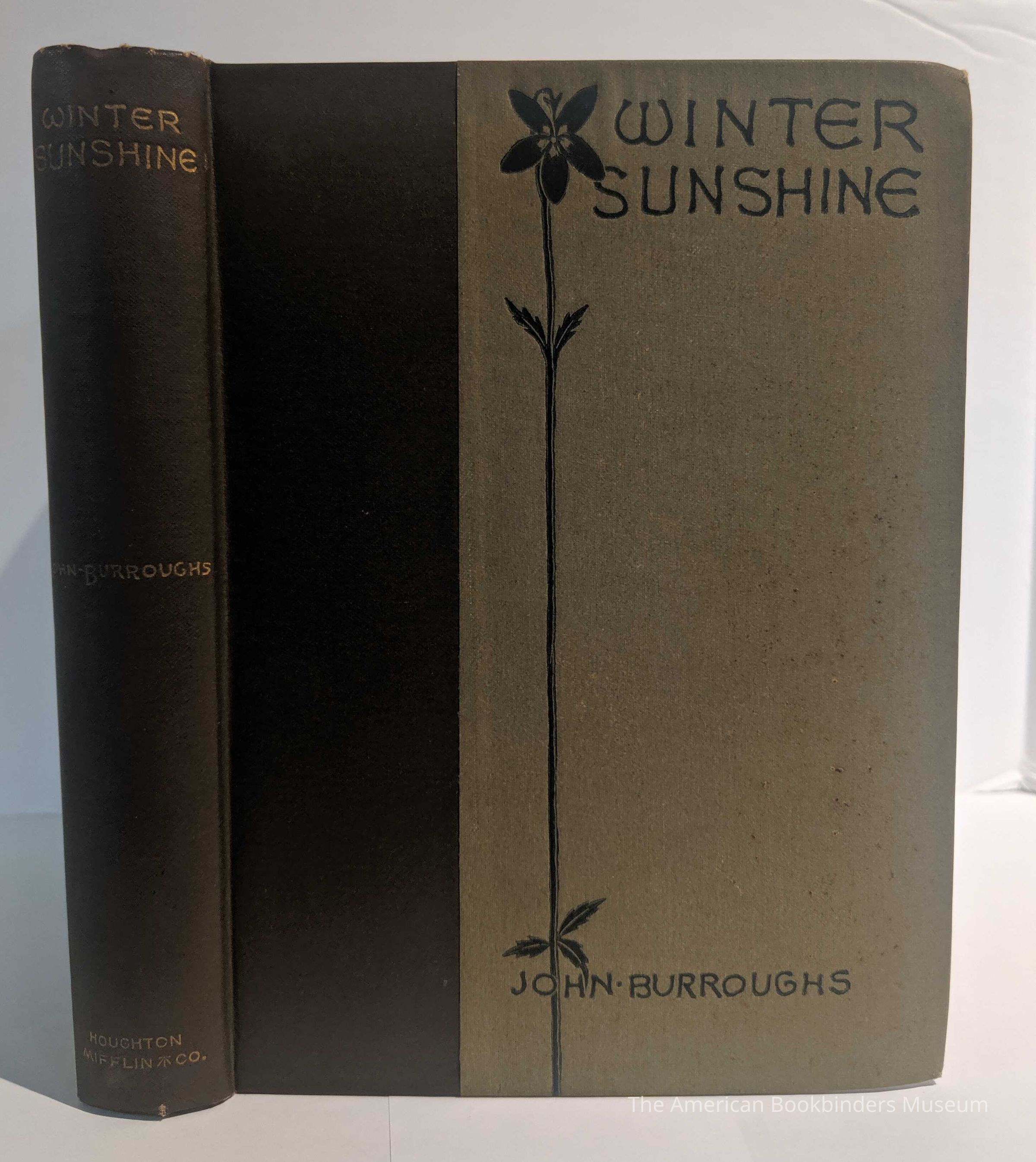 Bound in a three-pice binding of a wide smooth grain deep olive/brown cloth to the spine, which extends into a third of the cover space, where it is joined by a lighter olive colored cloth. A dark green vertical long-stemmed art nouveau flower (poppy?) is stamped next to the cloth join, from the bottom where the stem bisects the author's name, to the top where it just hits the title. Spine title and author stamped in gilt. Top edge gilt. Lettering in Whitman's signature typography. The effect is one of elegant monochrome simplicity. This is a uniform Whitman binding for a series of Burroughs titles issued by HM in the late 1890s, with the only variation being the blossom design.