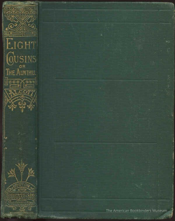 Bound in green cloth with blind stamped rectangular panels to the front cover, gilt Eastlake design to the spine. Spine Title reads EIGHT COUSINS OR THE AUNTHILL. Brown stone coated endpapers.Relationships