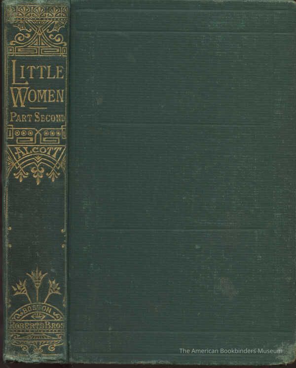 Bound in green cloth with blind stamped rectangular panels to the front and rear cover. Gilt Eastlake design to the spine. Spine title reads LITTLE WOMEN PART SECOND. Green floral endpapers.Notes