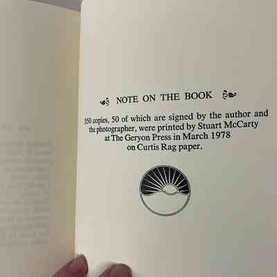 From colophon at back - 350 copies, 50 signed by author and photographer, printed letterpress by Stuart McCarty at the Geryon Press in March 1978 on Curtis Rag Paper.