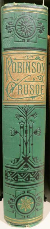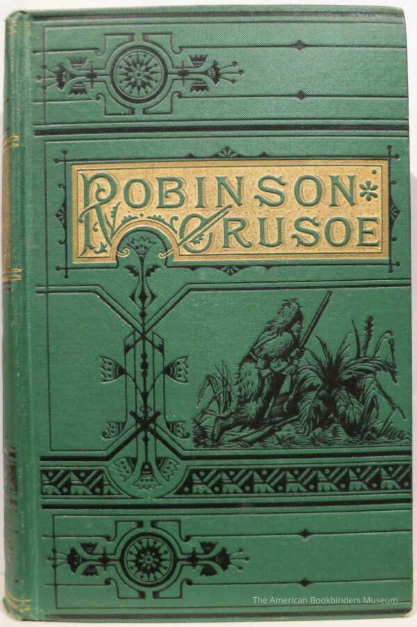 Bound in bright green cloth with Eastlake black stamping to spine and front board, highlighting a small stamping of Crusoe. Gilt titles to front and spine. Olive green stone endpapers.