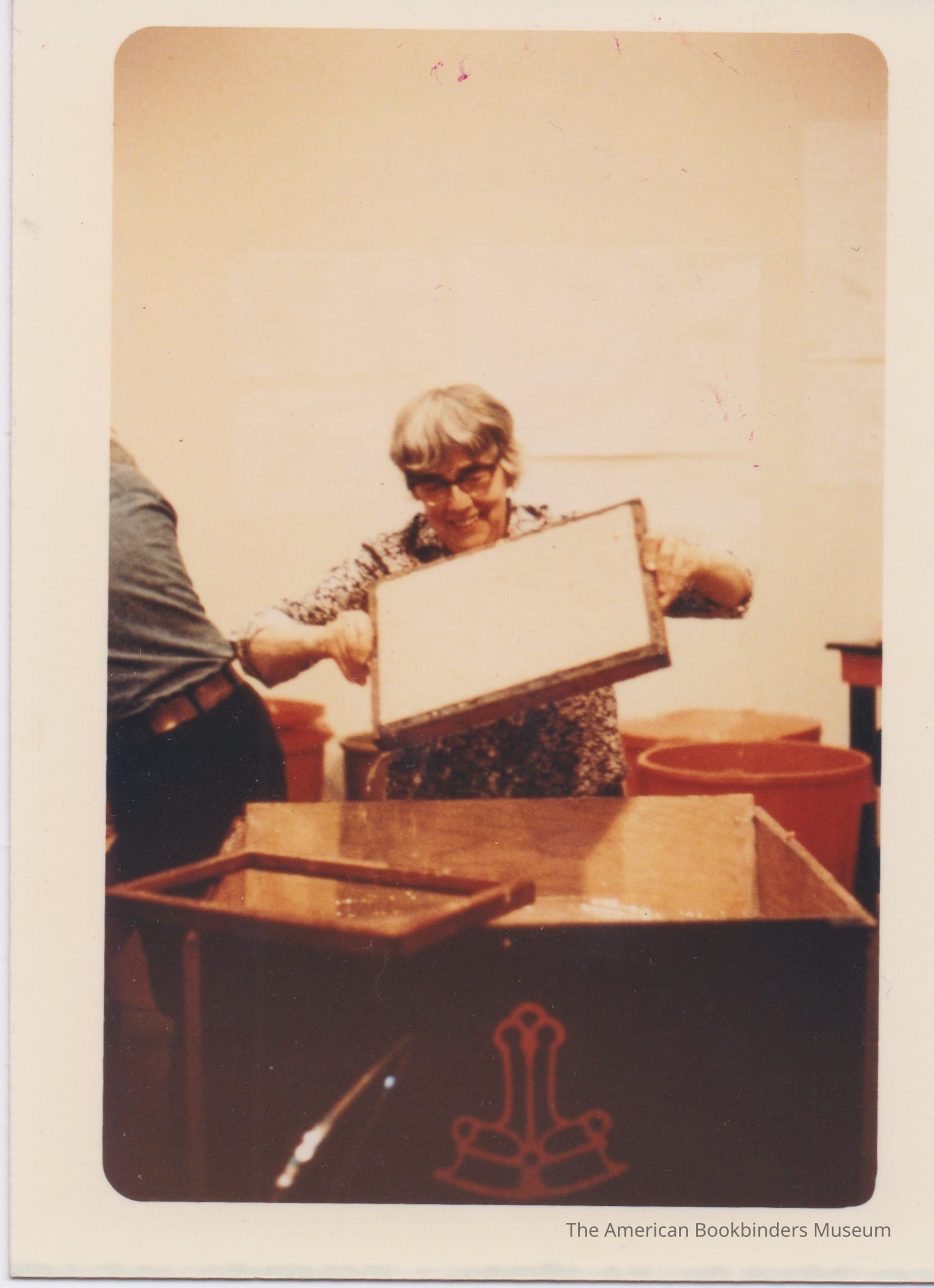 Photo showing papermaking. Stella Patri is holding up a drained mold with pulp on it before couching the sheet. Therei s a tub of pulp with the frame of the mold balancing on the edge. A figure to the left is leaning out of frame. Buckets are shown around her. Same moment is shown in 2023.9.11.cl and 2023.9.11.cm.Photograph Details