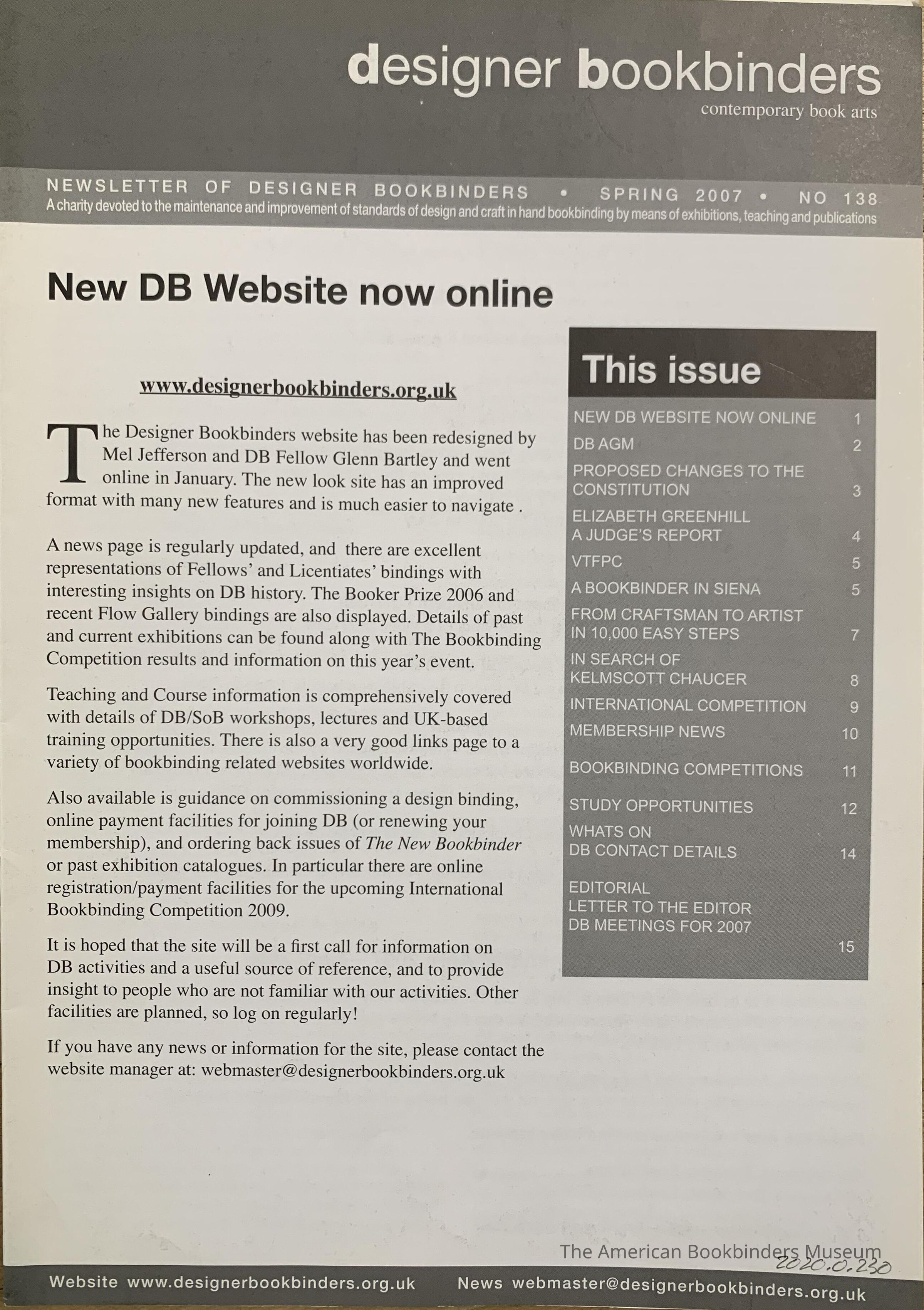 Designer Bookbinders newsletter; No. 138; Spring 2007.Entry/Object ID