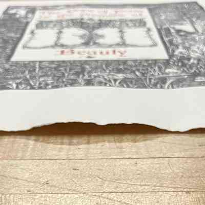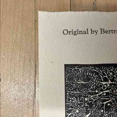 The center has a a rectangular text box, with text in red at the top and bottom of it. The middle space is filled with more vegetation, with four stalks rising toward fruit pods (?). Printing information on the right side. Bottom and right edges are raw.Collection