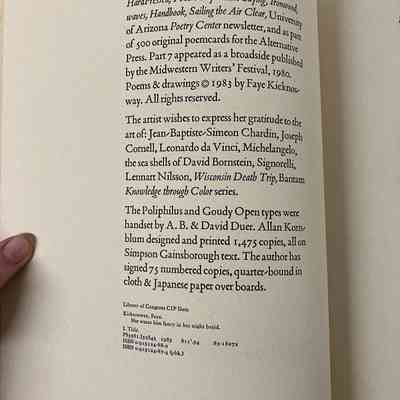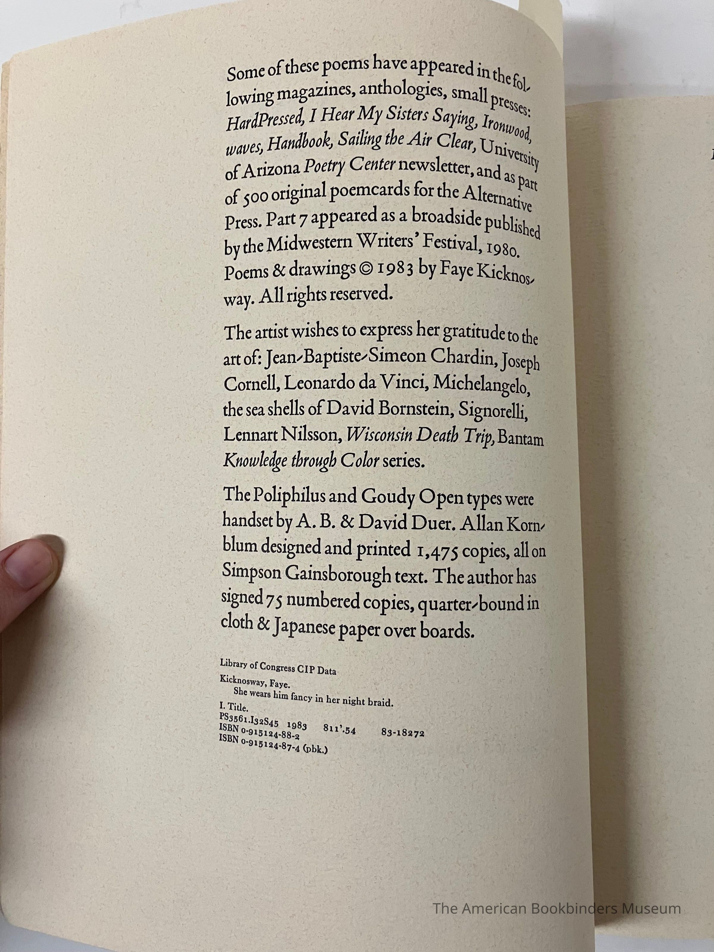 Colophon, at the end of publishing information - Poliphilus and Goudy Open types handset by A. B. & David Duer. Allan Kornblum designed and printed 1,475 copies, all on Simpson Gainsborough text. Author signed 75 numbered copies, quarter-bound in cloth & Japanese paper over boards.Relationships