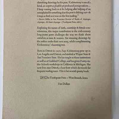 Exploring the nature of birth, courtship, & female consciousness, this major contribution to the 10th-century long-poem genre challenges the way we think about ourselves as men & women. Six stunning drawings by the author evoke their own story, while complimenting Kicknowsway's haunting text.Collection
