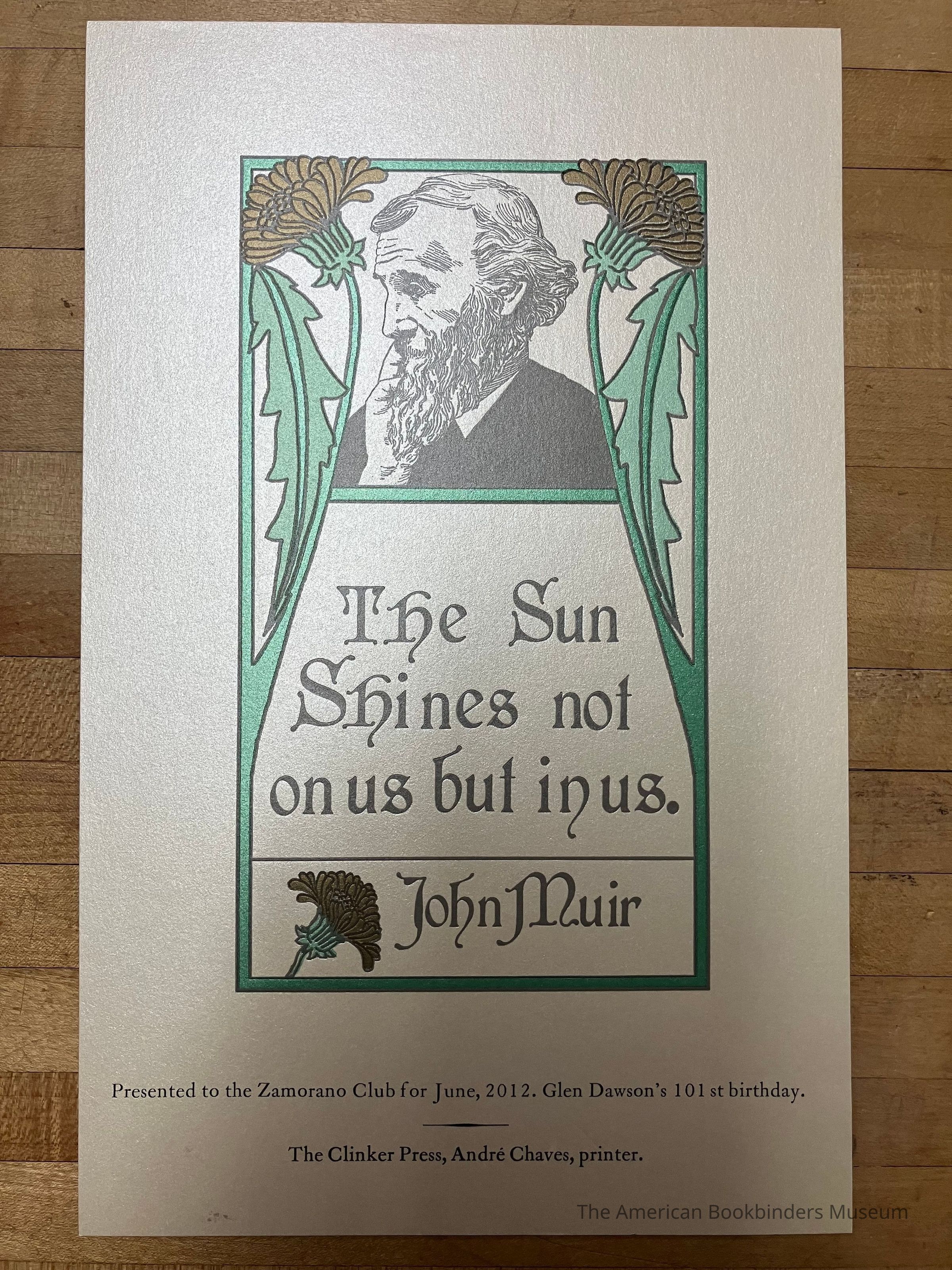 A green frame, with stems coming out of it, heading toward the center before turning into a gold flower in the top corners. Top half of the frame is an etching of John Muir in gray. Below is text also in gray, with the same flower appearing next to Muir's name. White paper with a fine shimmer.Collection