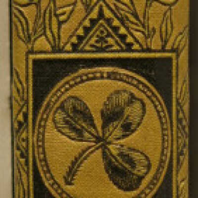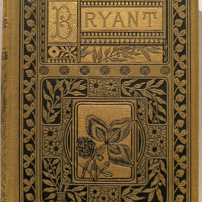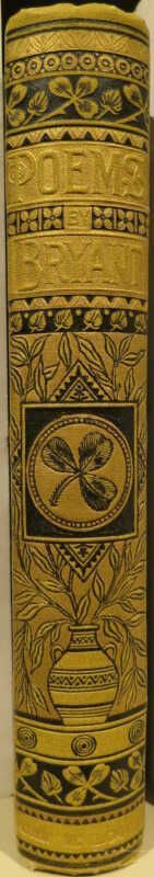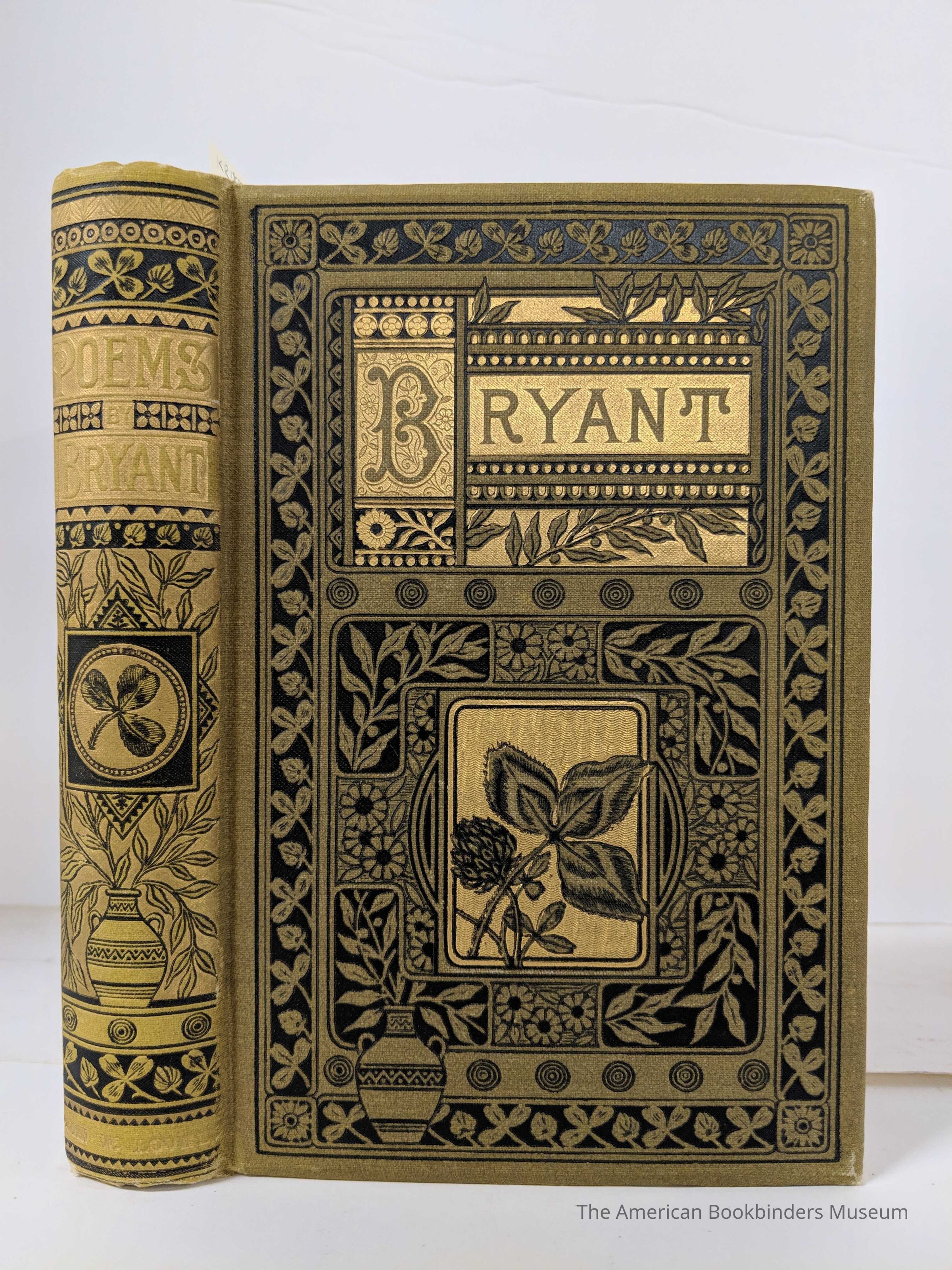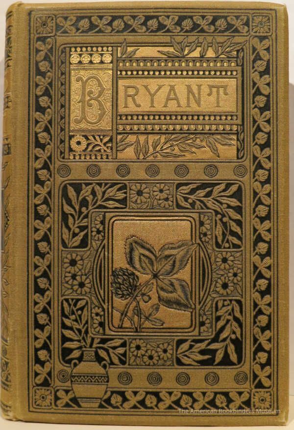 Bound in olive beveled cloth with black and gilt stamping of intricate borders of flowers, leaves, repeat patterns, and classical urn. Eastlake elements. Spine features a classical urn and a three leaf clover. Publisher's name in gilt to the bottom of spine: John W. Lovell. All edges gilt. Tan floral endpapers.