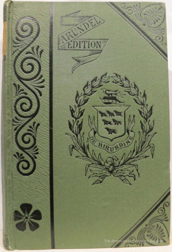 Bound in green cloth with black stamped simplified stamping to corners and central design. "Arundel Edition" stamped in black in a ribbon banner to cover. Wide gilt stamped title band to spine and a black stamped classical standing female. Brown floral endpapers.