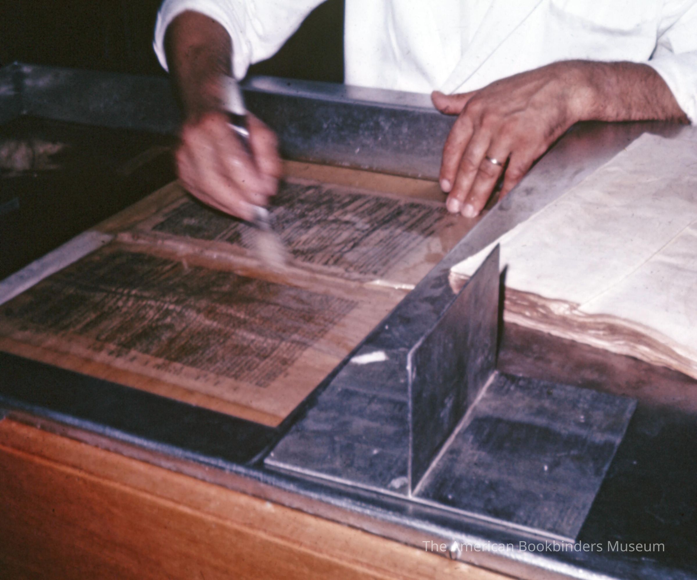 Scan of a slide. Shows a conservator brushing off a page.Photograph Details