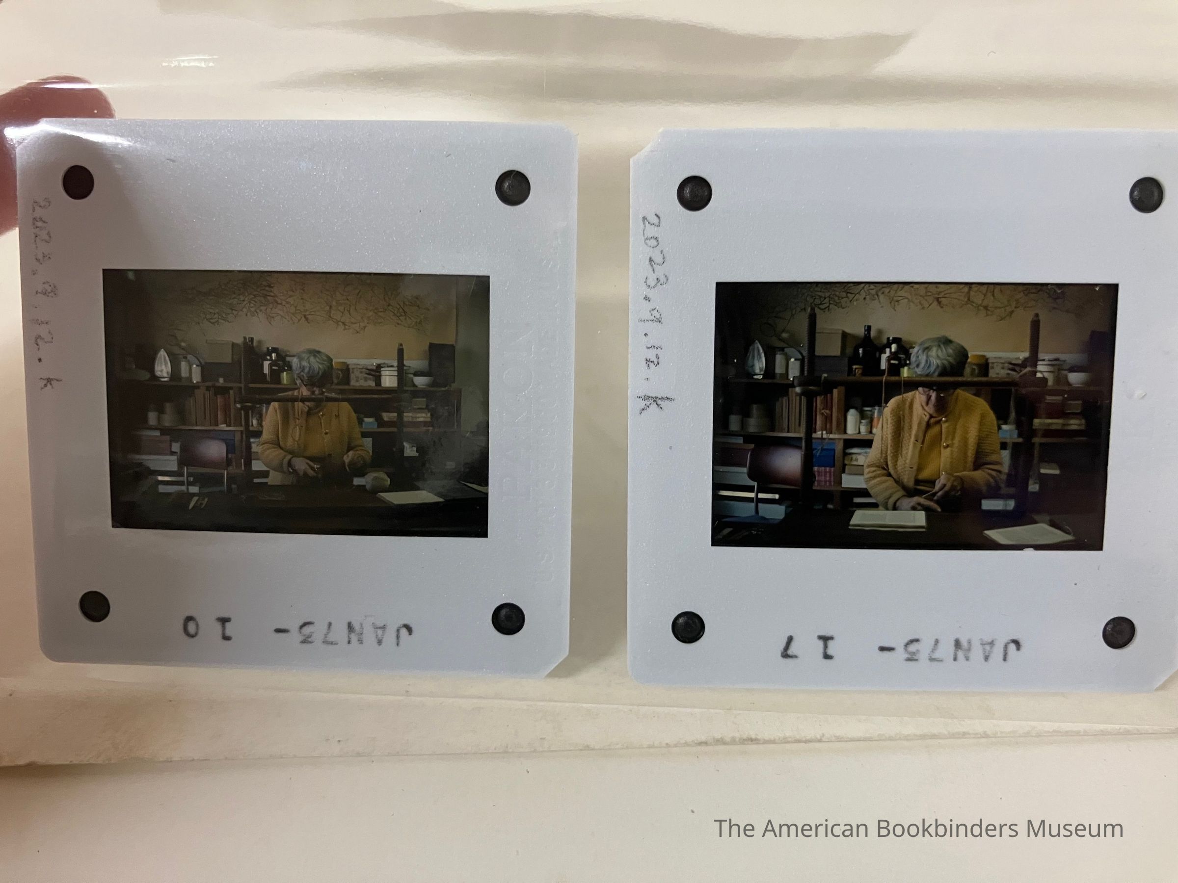 Two slides showing Patri behind a sewing frame. Various bookbinding materials are on the shelves behind her.Photograph Details
