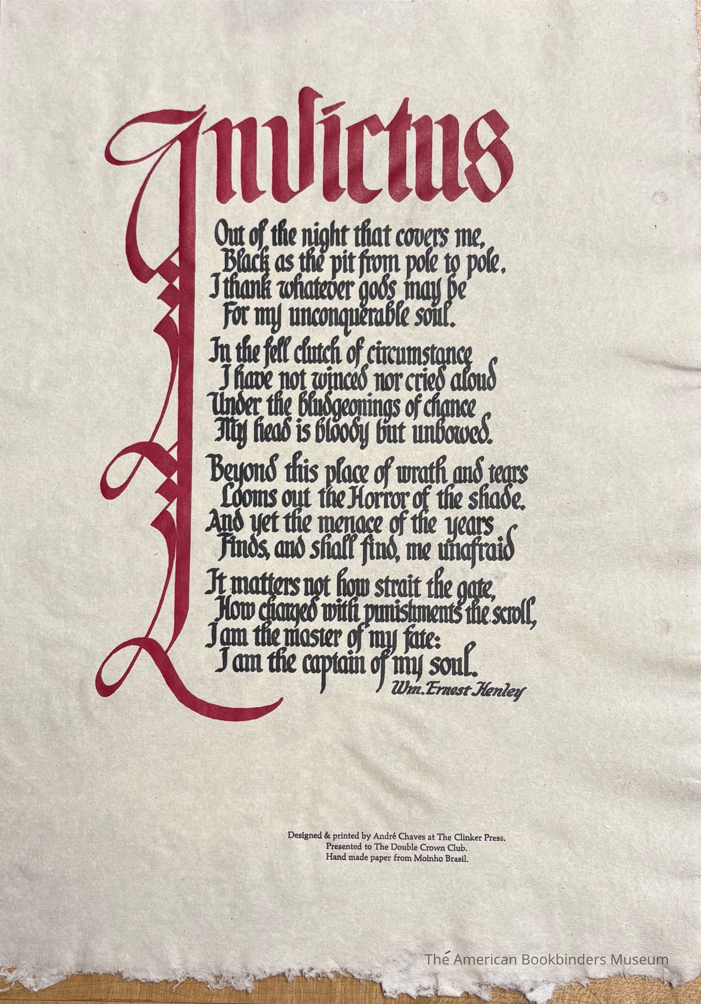 Poem by William Ernest Henley, printed in red & black on cream paper with deckled edges bottom and right.Collection