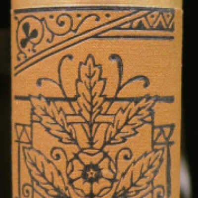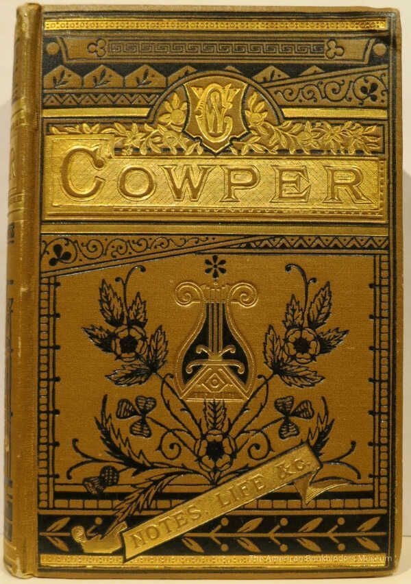 Bound in brown beveled cloth with black stamping over entire cover and spine in a classical decoration of urn and floral design to cover and spine, but encompassing elements of both Eastlake design and asymmetry. Urn on spine is gilt stamped, as is title and decoration to cover and wide title band to spine. Red bordered text. Dark grey stone endpapers. All edges gilt.Exhibition