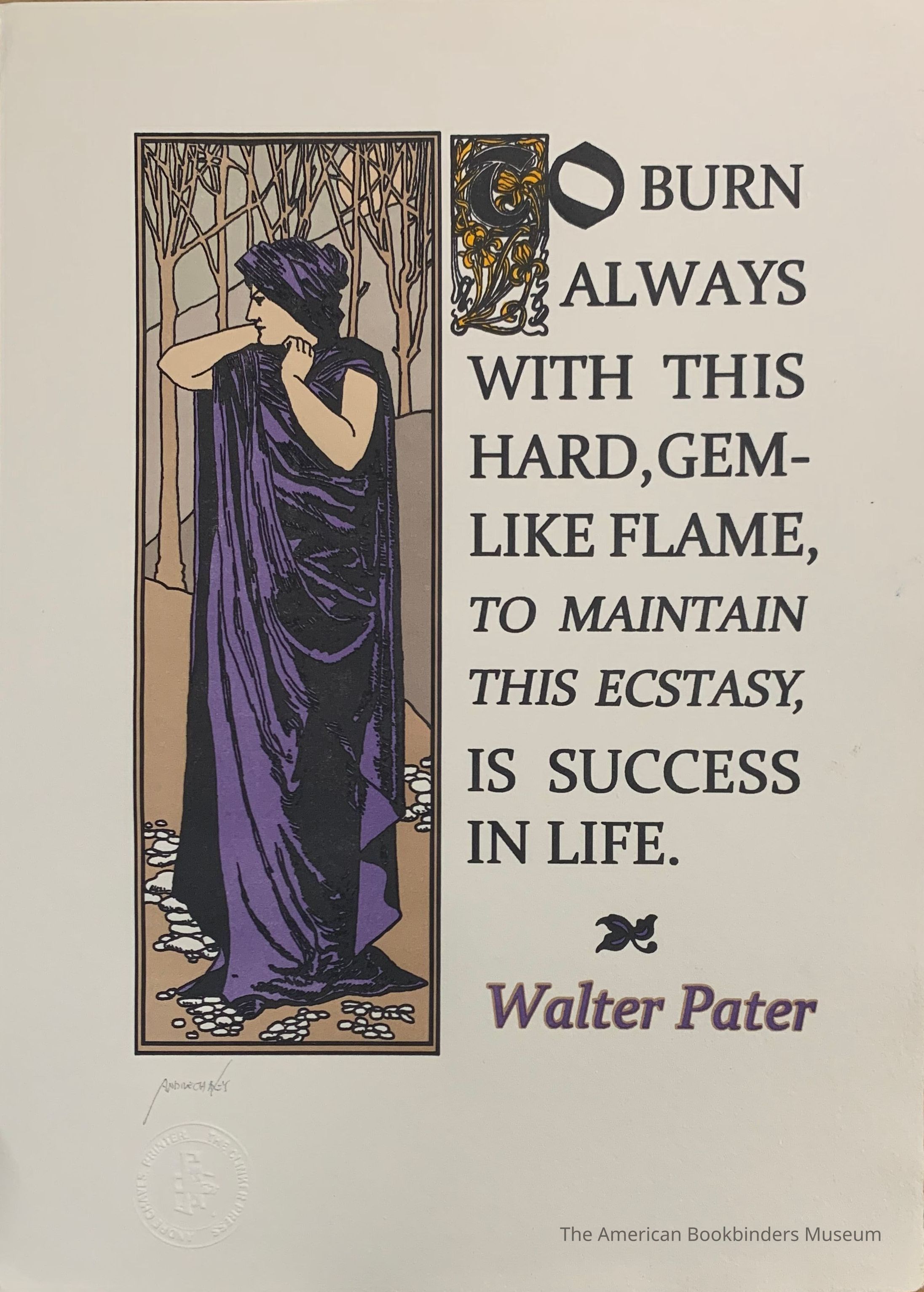 Image of a woman dressed in purple with background of brown bare trees, with quote in black, on light tan paper with bottom and right deckled edges.Collection