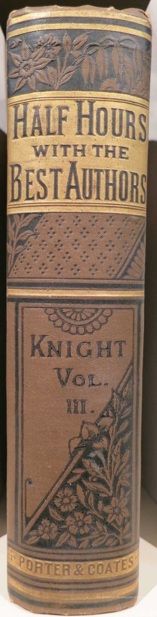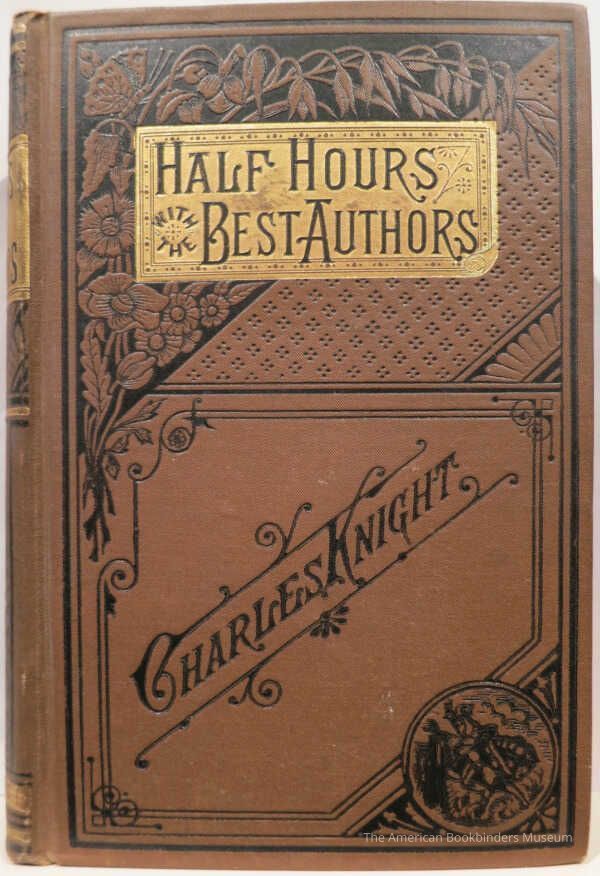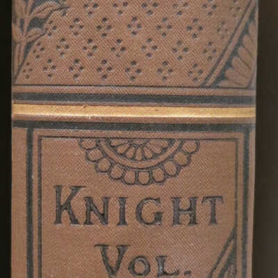 Bound in brown cloth with black stamped diagonal design of geometric patterns and florals, repeated to spine. "Charles Knight" on a diagonal to cover stamped in black. Wide gilt stamped title band to spine and cover. Brown stone endpapers.