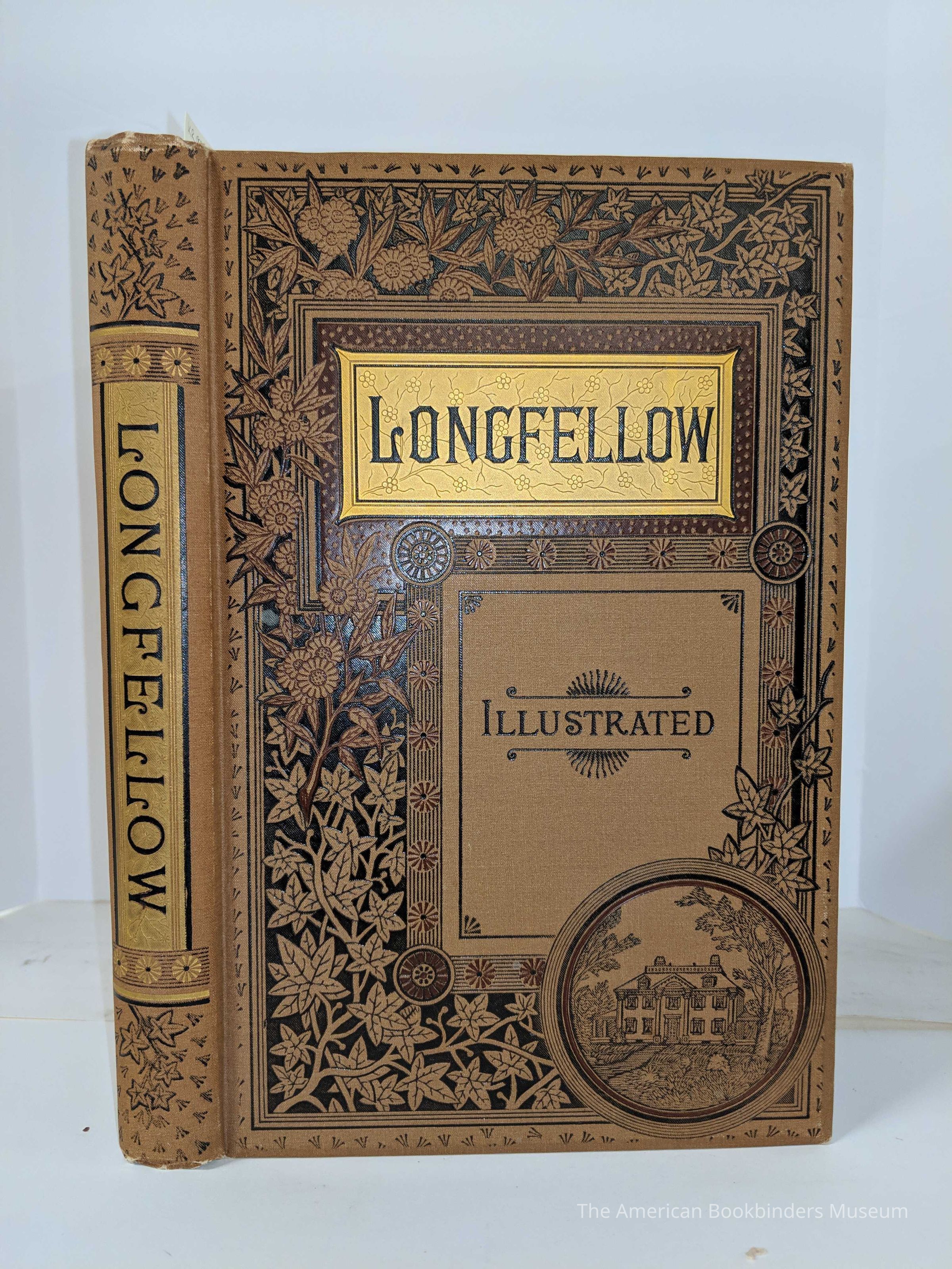 Bound in tan beveled cloth with a left vertical and top panel of climbing vine with leaf and flower. Stamped in black and red. Medallion stamping in black to bottom right of Longfellow's home. Title stamped in dark green to rectangular gilt panel on cover, also on vertical length of spine. Dark brown stone endpapers. All edges gilt.Notes