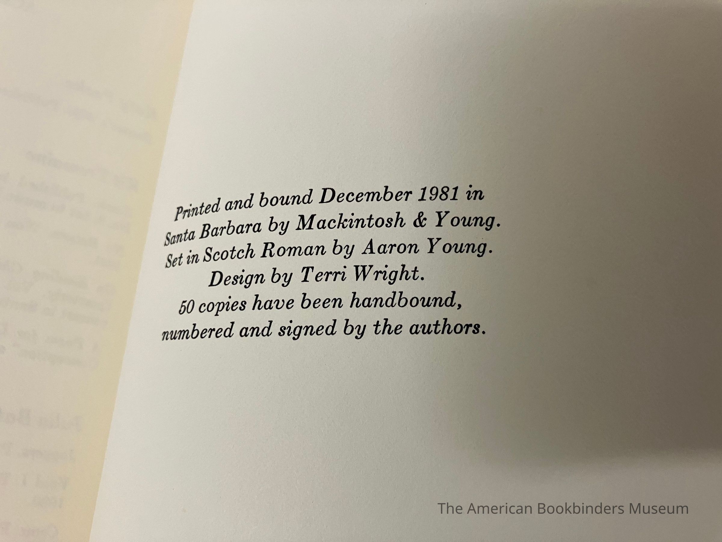 From colophon at back - Printed and bound December 1981 in Santa Barbara by Mackintosh & Young. Set in Scotch Roman by Aaron Young. Design by Terri Wright. 50 copies handbound, numbered and signed by authors.