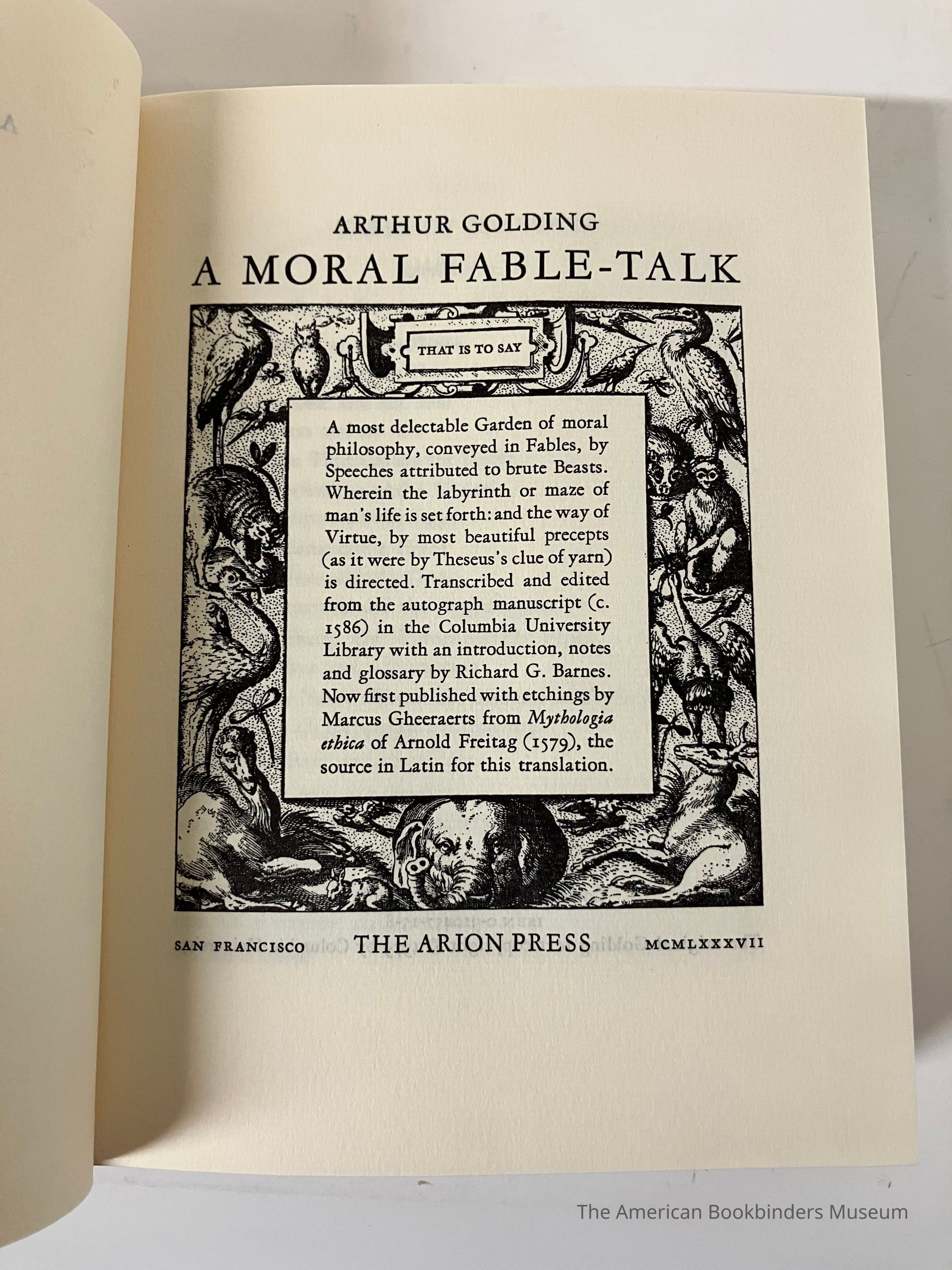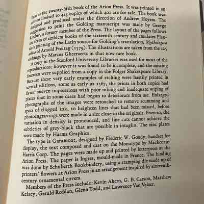 Colophon at back - 25th book of the Arion Press. Printed in edition 425 of which 400 are for sale. Designed by Andrew Hoyem. A copy of ‘Mythologica ethica’ by Arnold Freitag in the Stanford University Libraries was use for most of the reproductions, filled in with a copy from the Folger Shakespeare Library. Type is Garamont. Pages printed at Arion Press. Paper is Ingres. Binding by Schuberth Bookbinding.